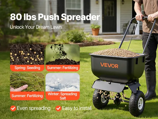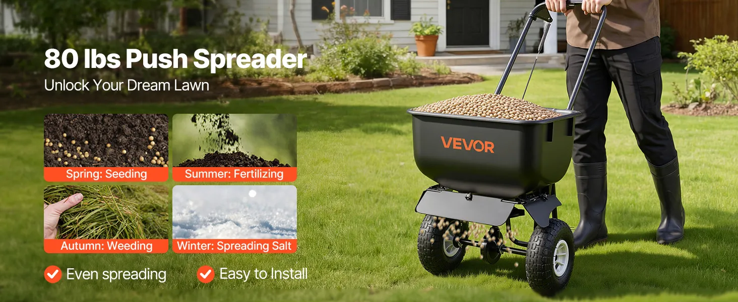 Year-Round Versatility: This push spreader is ideal for spring seeding, summer fertilizing, fall weed control, winter ice melting. This all-in-one tool replaces 4 separate devices, meeting diverse needs from household lawn care to small-scale farm maintenance