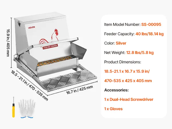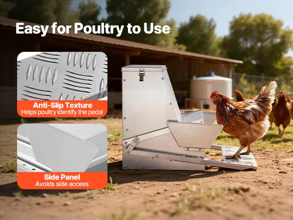 Adjustable for Different Poultry: The treadle poultry feeder adjusts from 18.5 in (470 mm) for small/young birds to 20.7 in (525 mm) for medium/adult poultry. Textured, non-slip surface helps chickens adapt, and side panels avoid injury from side feeding