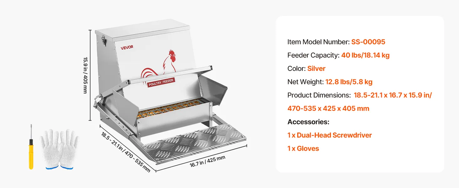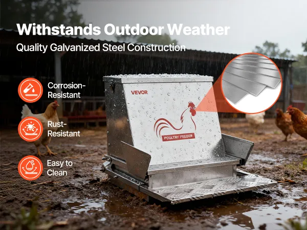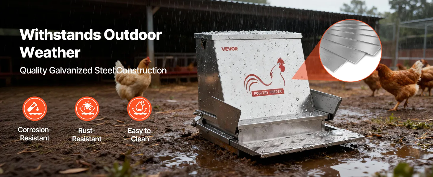 Durable & Built to Last: Crafted from galvanized steel, this automatic chicken feeder is corrosion-resistant, rust-proof, and easy to clean—ideal for indoor or outdoor use in changing weather. Comes with a clear user manual and tools for easy assembly