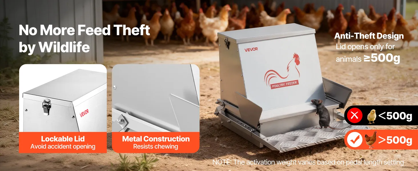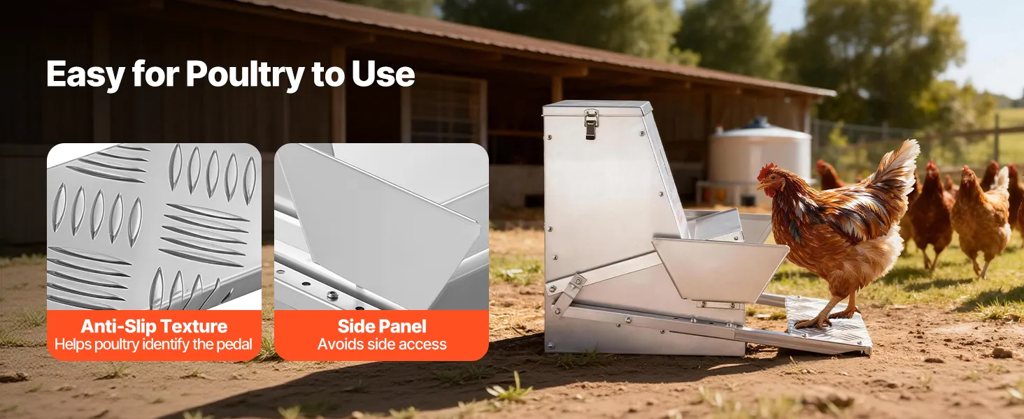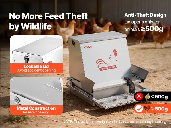 Automatic Treadle Feeder: This metal automatic chicken feeder opens when poultry ≧500 g step on and closes when they leave. The lockable lid blocks small rodents from the feed. The soundproof strip reduces noise while the metal body resists chewing