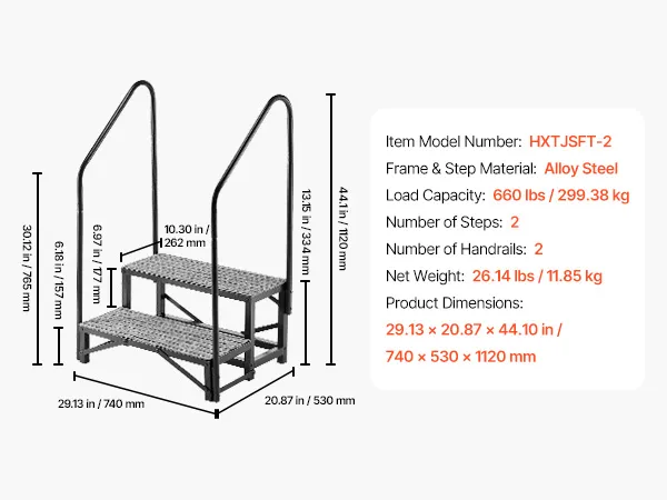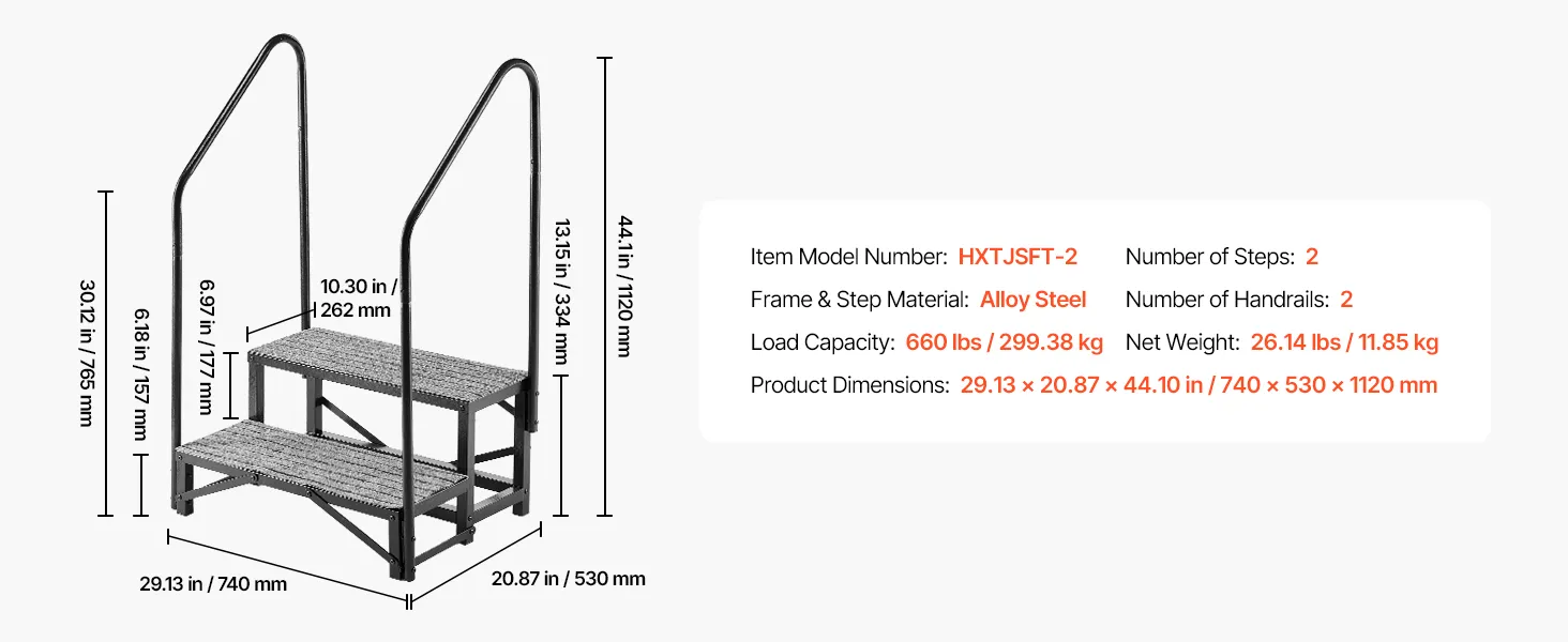 • Sturdy & Stable with High Load Capacity: This 2-step RV stair is made of heavy-duty alloy steel with reinforced crossbars on the bottom and a triangular support structure, supports up to 660 lbs / 299.38 kg