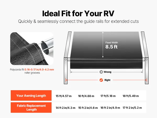 • Size Options: Available in 15 ft (4.57 m), 16 ft (4.88 m), 17 ft (5.18 m), and 18 ft (5.49 m), our awning fabric fits most manual and electric RV awnings. Measure the distance between the center of the right and left awning arms before purchase