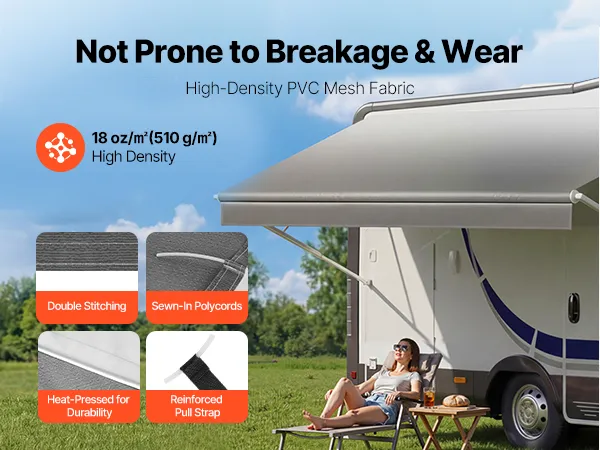 18 oz Heavy-Duty Fabric: Crafted from 4-layer high-density 18 oz/㎡ (510 g/㎡) PVC mesh, this replacement RV awning fabric withstands strong winds, tears, and wear. Double stitching and heat-sealed seams deliver lasting performance for outdoor use