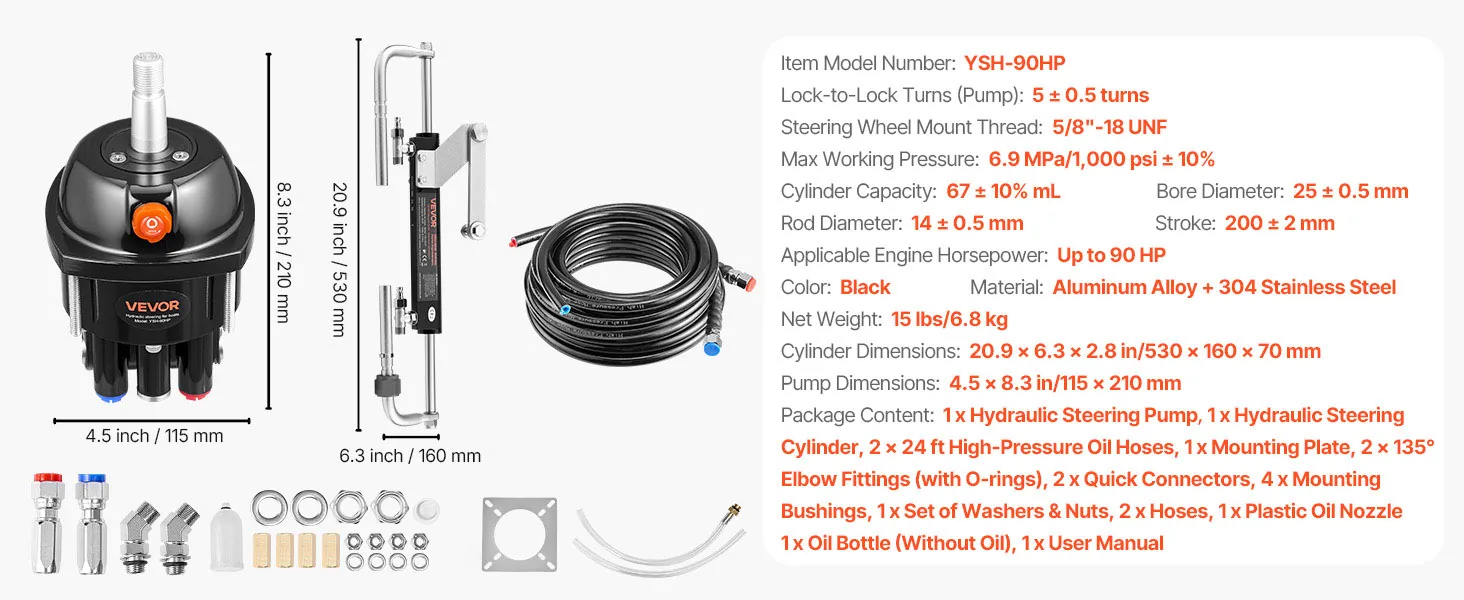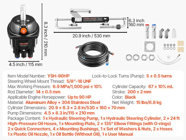 Handle Up to 90 HP Engines: This hydraulic steering kit delivers steady, efficient steering performance for outboards up to 90 HP, providing a 5 turns lock-to-lock for precise and responsive handling on every trip