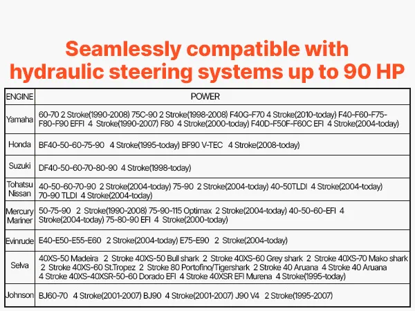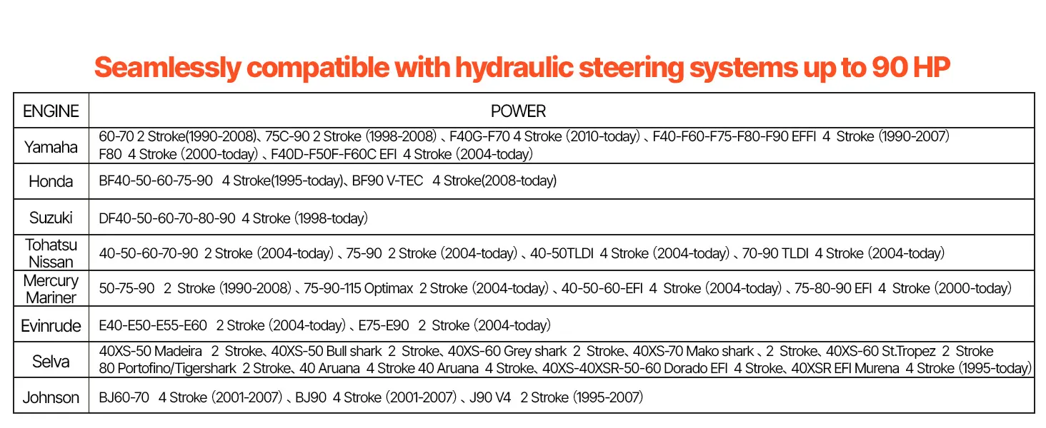 Q: How do I know if this hydraulic steering kit fits my outboard model? A: We provide detailed compatibility images on the product page. Simply compare your outboard model with the chart shown to confirm the correct match before purchasing.