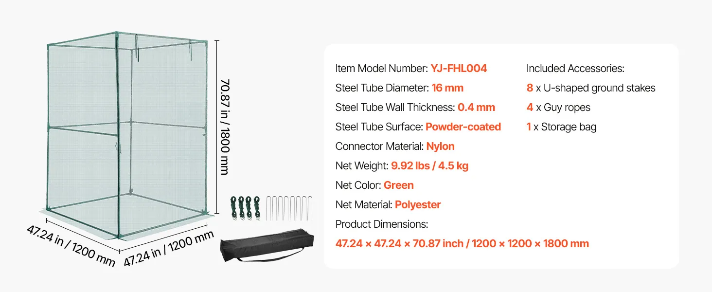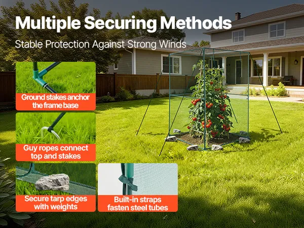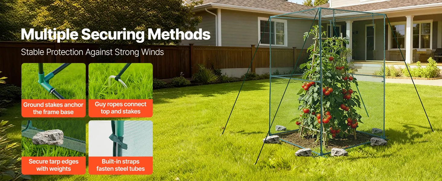 Stable & Wind-Resistant: Made of powder-coated steel tubes, our plant protection tent is rust- and corrosion-resistant. Reinforced plastic joints and side support rods add stability, while U-shaped ground stakes and guy ropes provide wind resistance