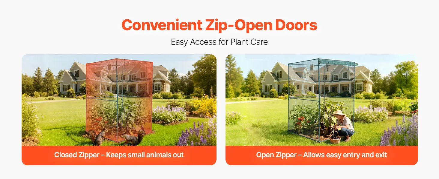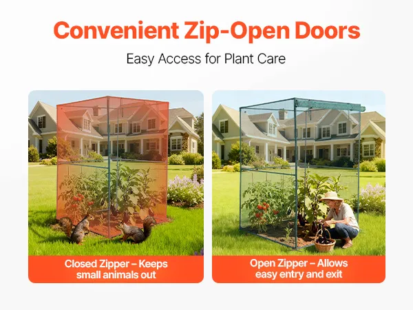 Equipped with convenient zip-open doors, this plant cage provides great ease for plant care. Zip closed to form a secure barrier against small animals, or unzip to easily access your plants for hassle-free plant care.