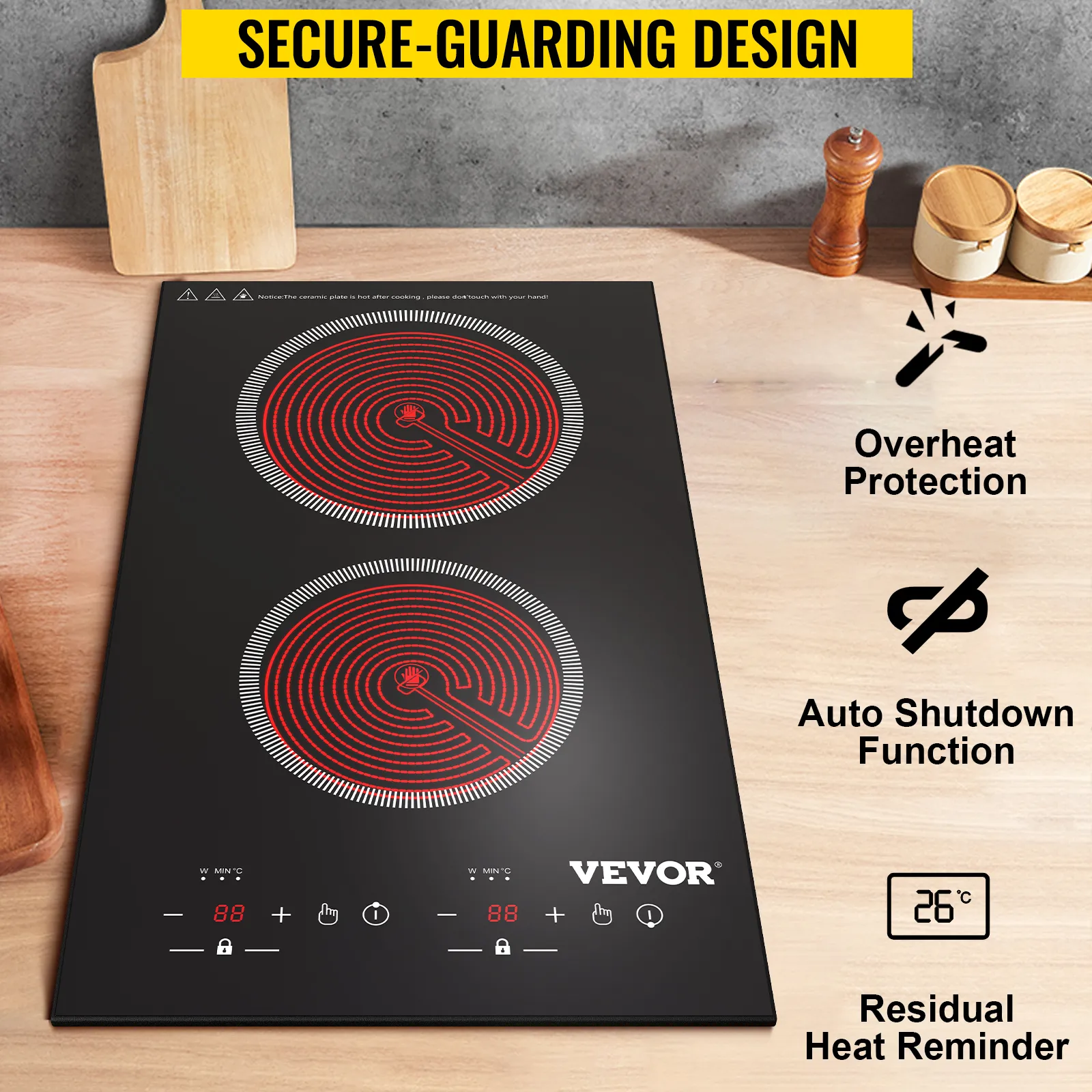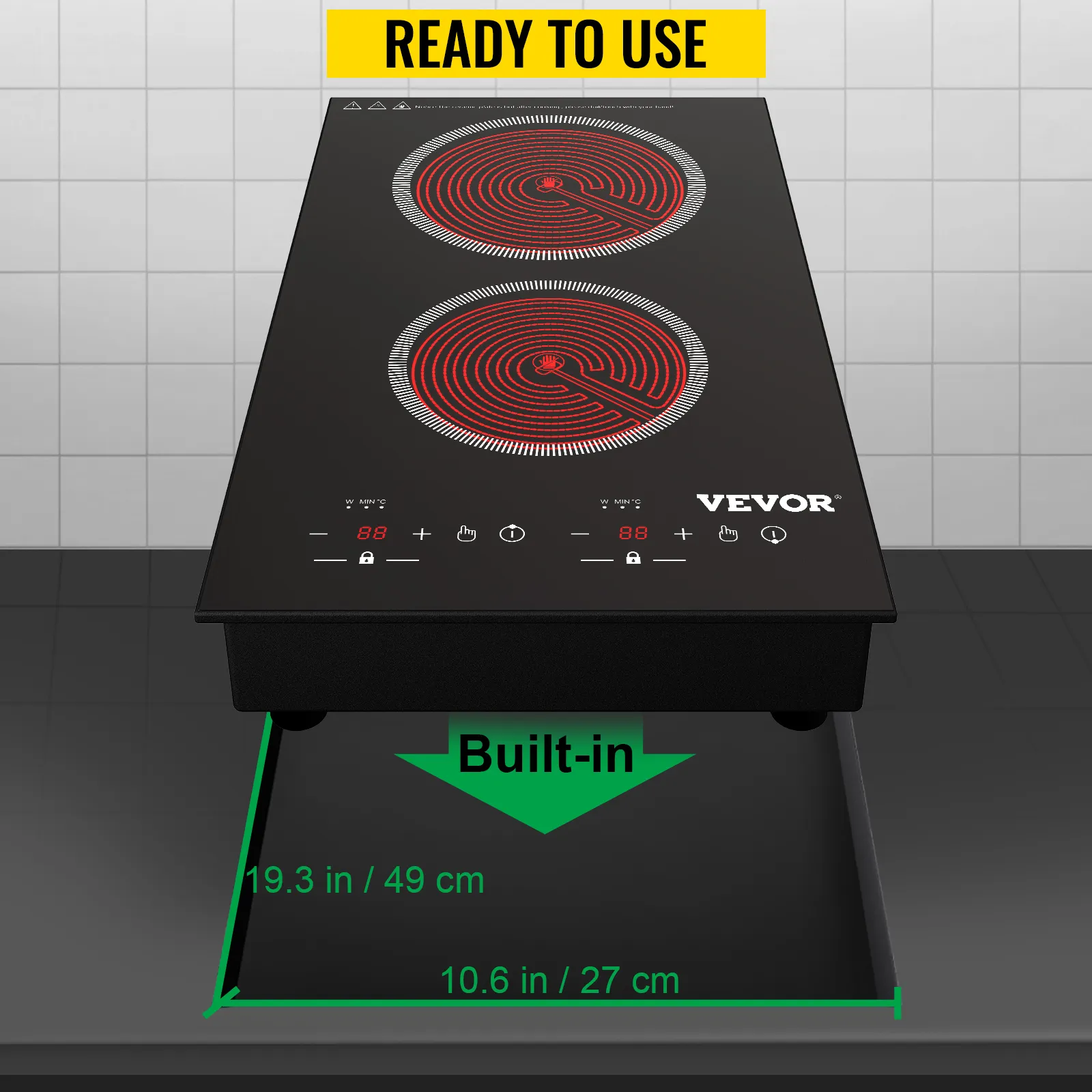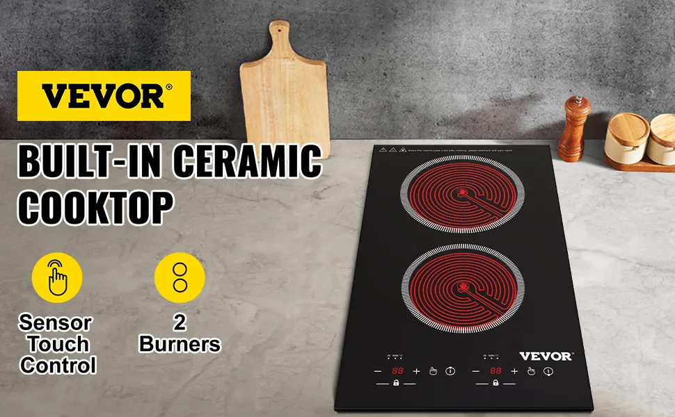 • Our radiant cooktop adopts 2 burners with strong power, offering rapid and stable heating. It is equipped with sensor touch controls with 9 heating levels, a boost function, and a timer function. Meanwhile, there are several measures for security, including child lock, overheat protection, auto shut-off, and a residual heat indicator. This built-in ceramic cooktop is going to be your number one cooking companion. Turn up the heat, outshine the competition, and get ready to turn heads with VEVOR's electric cooktop.