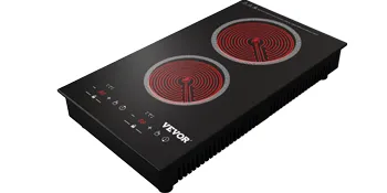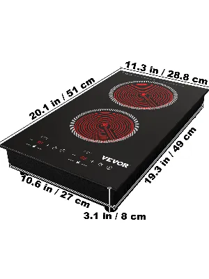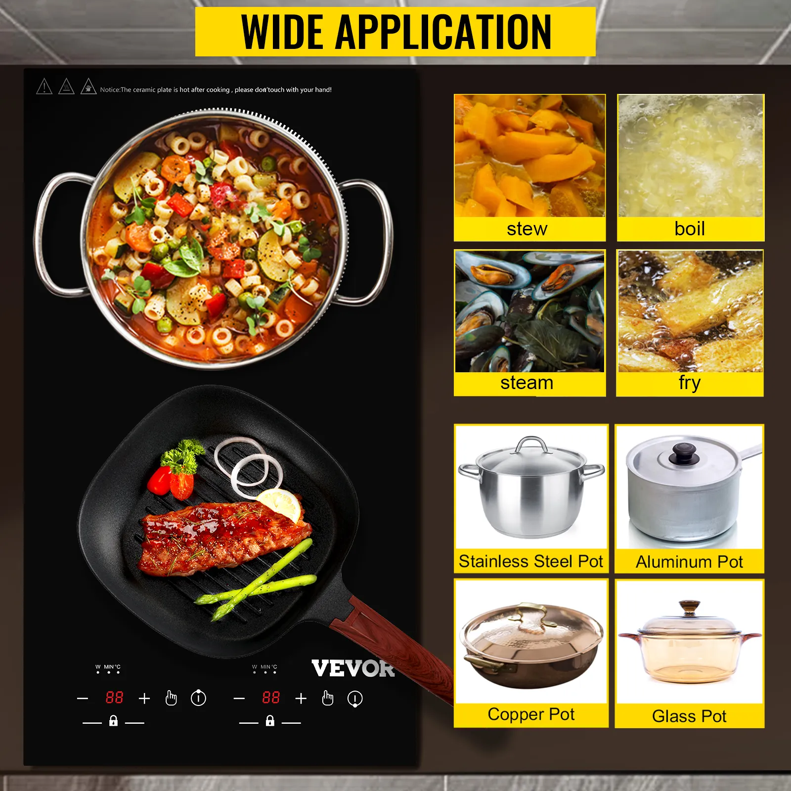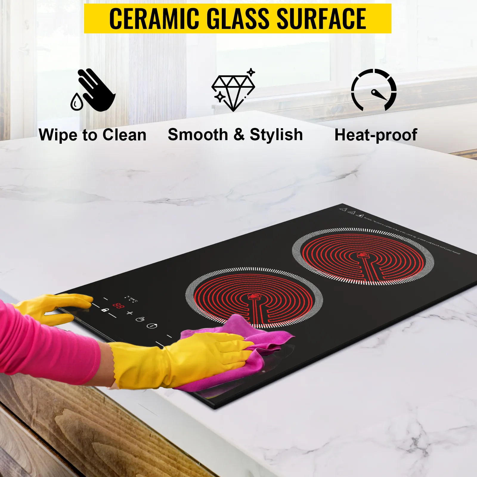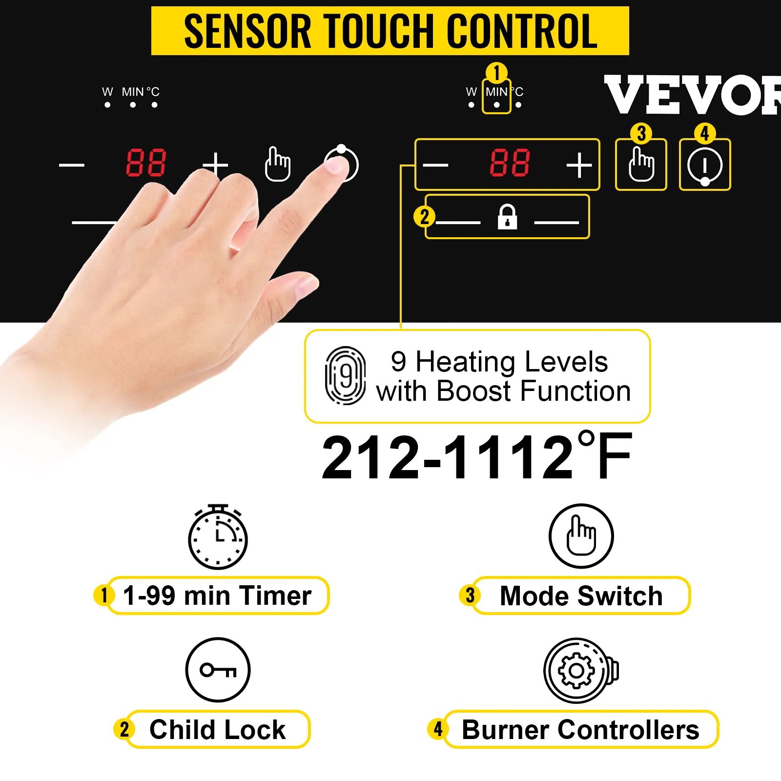 • Our radiant cooktop adopts 2 burners with strong power, offering rapid and stable heating. It is equipped with sensor touch controls with 9 heating levels, a boost function, and a timer function. Meanwhile, there are several measures for security, including child lock, overheat protection, auto shut-off, and a residual heat indicator. This built-in ceramic cooktop is going to be your number one cooking companion. Turn up the heat, outshine the competition, and get ready to turn heads with VEVOR's electric cooktop.