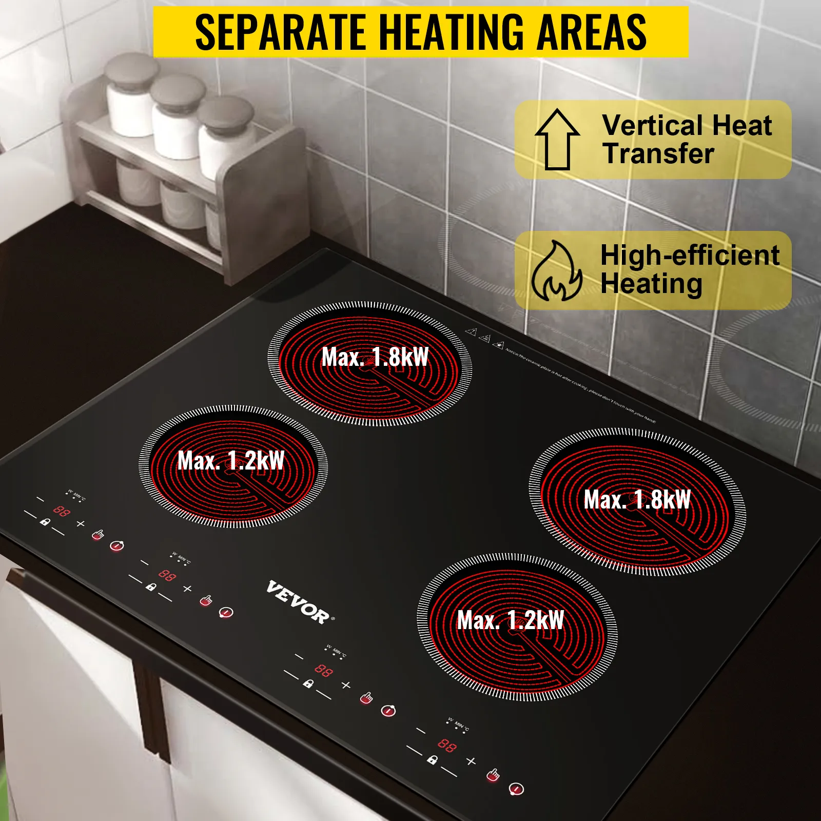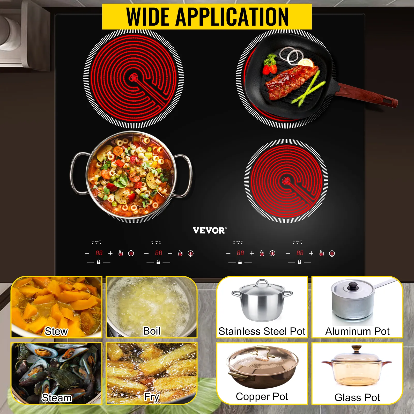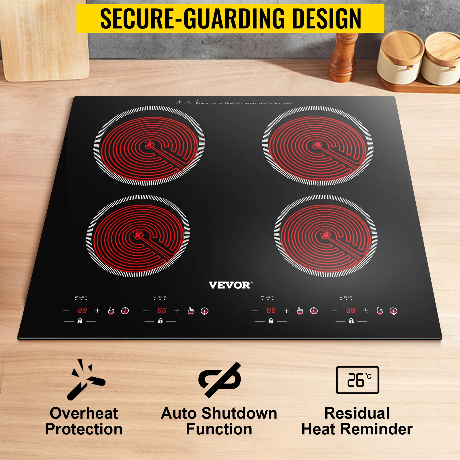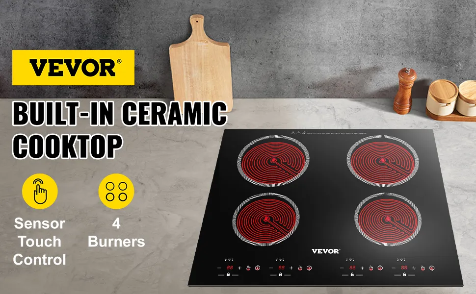 Our radiant cooktop adopts 4 burners with strong power, offering rapid and stable heating. It is equipped with sensor touch controls with 9 heating levels, a boost function, and a timer function. Meanwhile, there are several measures for security, including child lock, overheat protection, auto shut-off, and a residual heat indicator. This built-in ceramic cooktop is going to be your number one cooking companion. Turn up the heat, outshine the competition, and get ready to turn heads with VEVOR's electric cooktop.