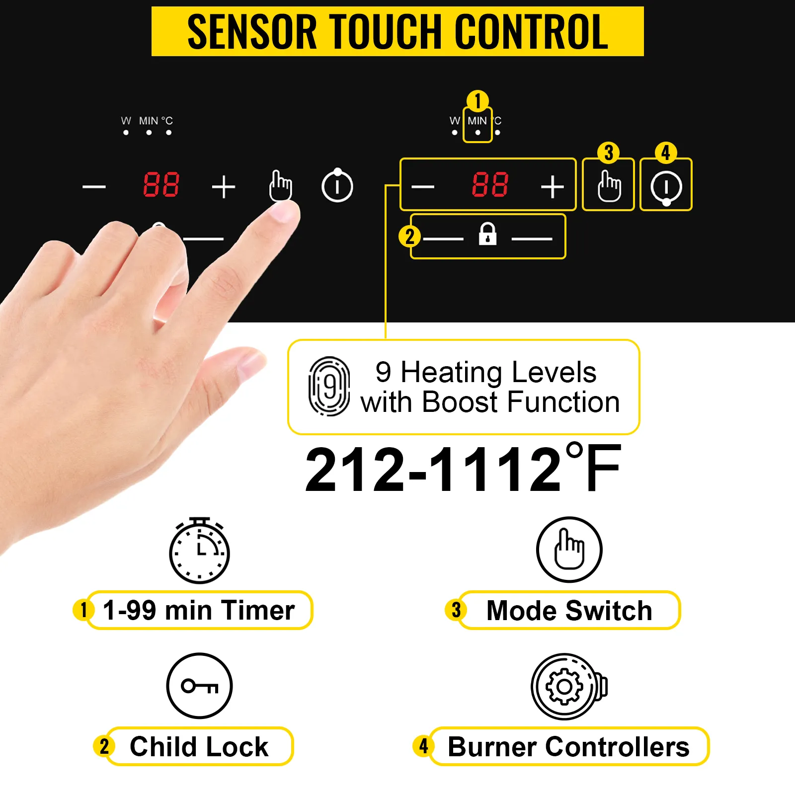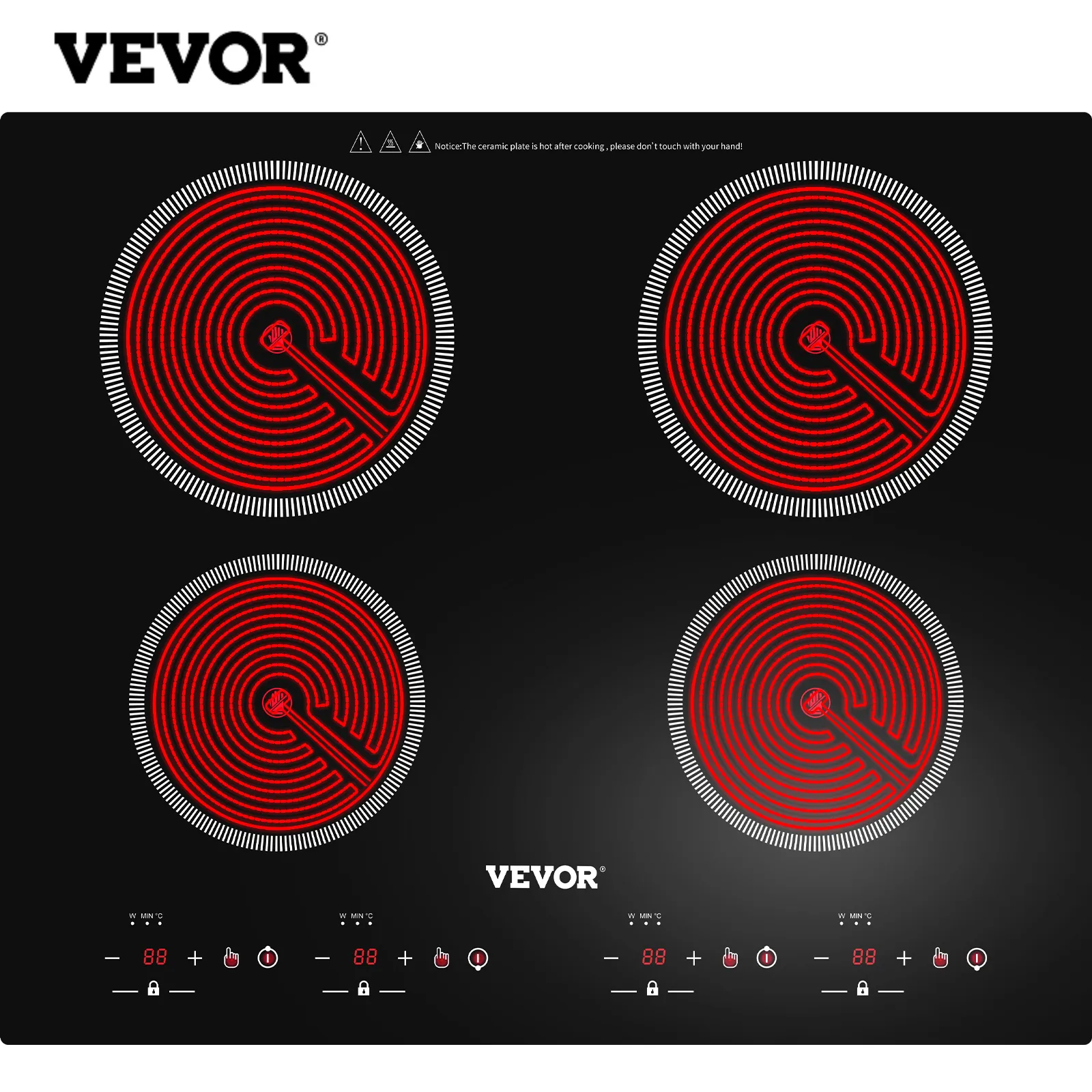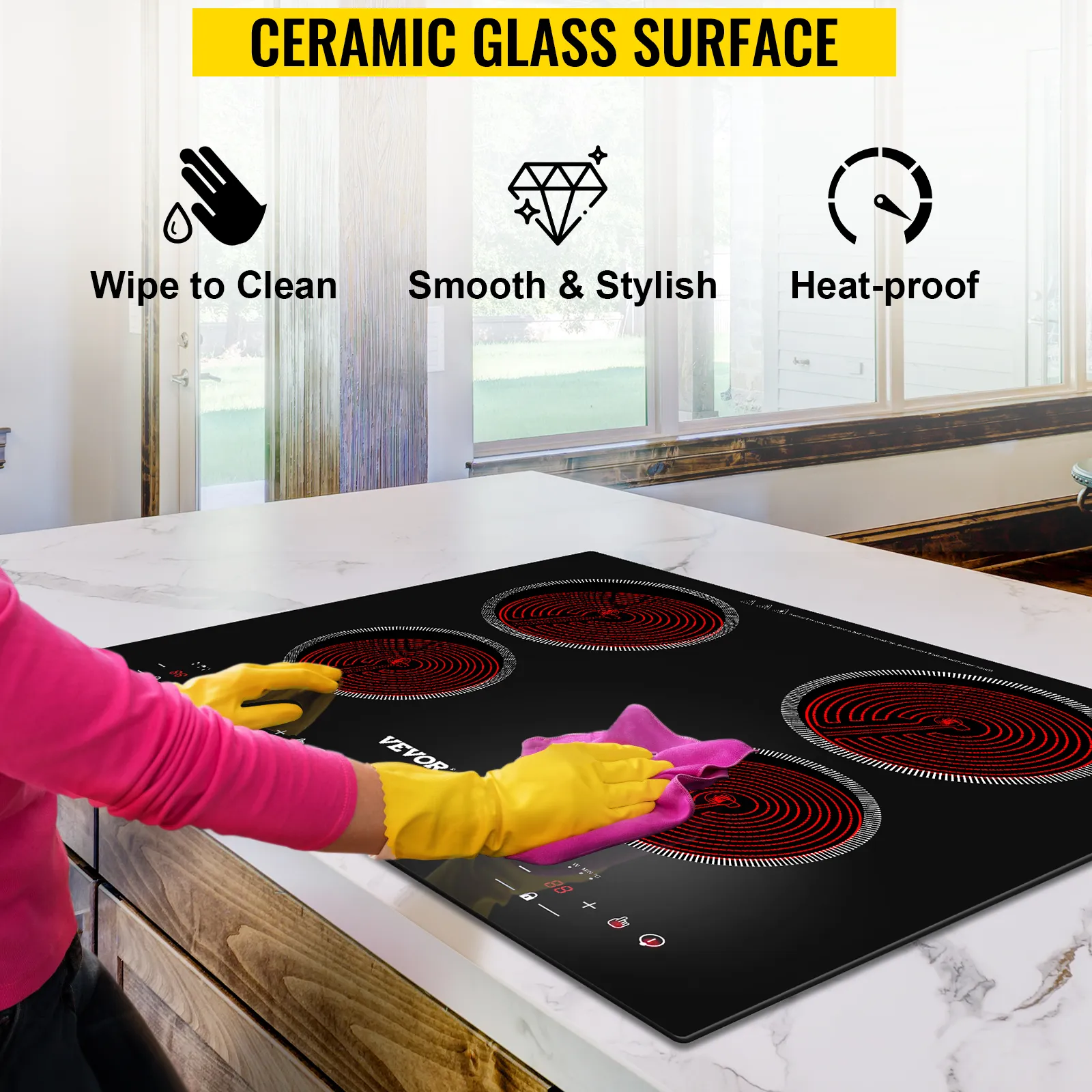 Our radiant cooktop adopts 4 burners with strong power, offering rapid and stable heating. It is equipped with sensor touch controls with 9 heating levels, a boost function, and a timer function. Meanwhile, there are several measures for security, including child lock, overheat protection, auto shut-off, and a residual heat indicator. This built-in ceramic cooktop is going to be your number one cooking companion. Turn up the heat, outshine the competition, and get ready to turn heads with VEVOR's electric cooktop.