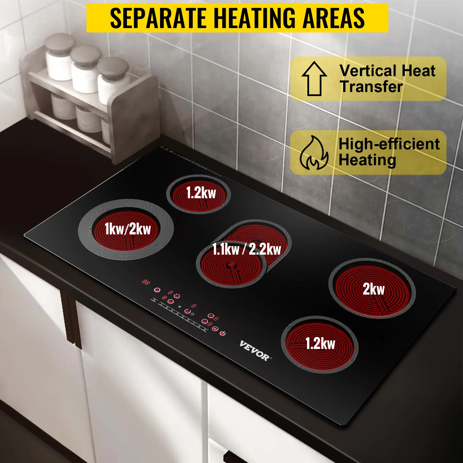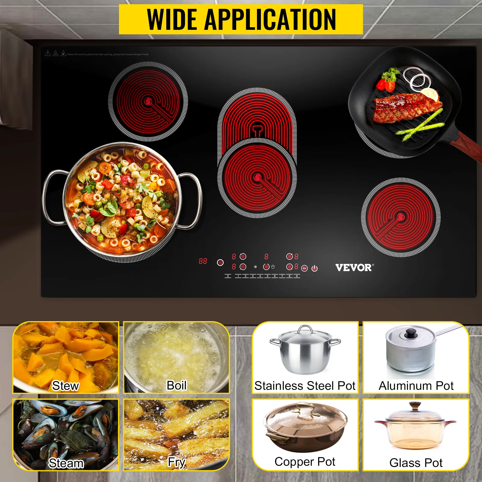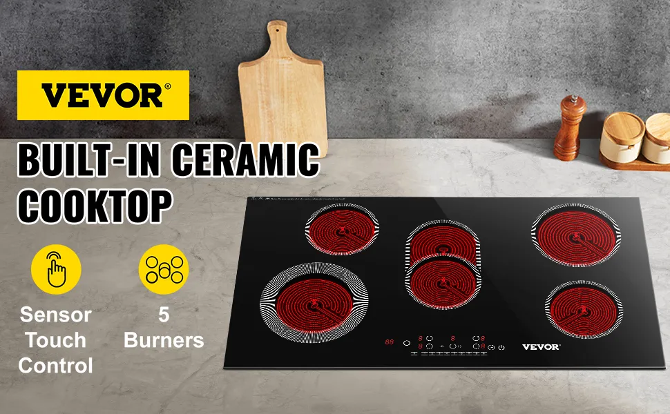 Our radiant cooktop adopts 5 burners with strong power, offering rapid and stable heating. It is equipped with sensor touch controls with 9 heating levels, a boost function, and a timer function. Meanwhile, there are several measures for security, including child lock, overheat protection, auto shut-off, and a residual heat indicator. This built-in ceramic cooktop is going to be your number one cooking companion. Turn up the heat, outshine the competition, and get ready to turn heads with VEVOR's electric cooktop.