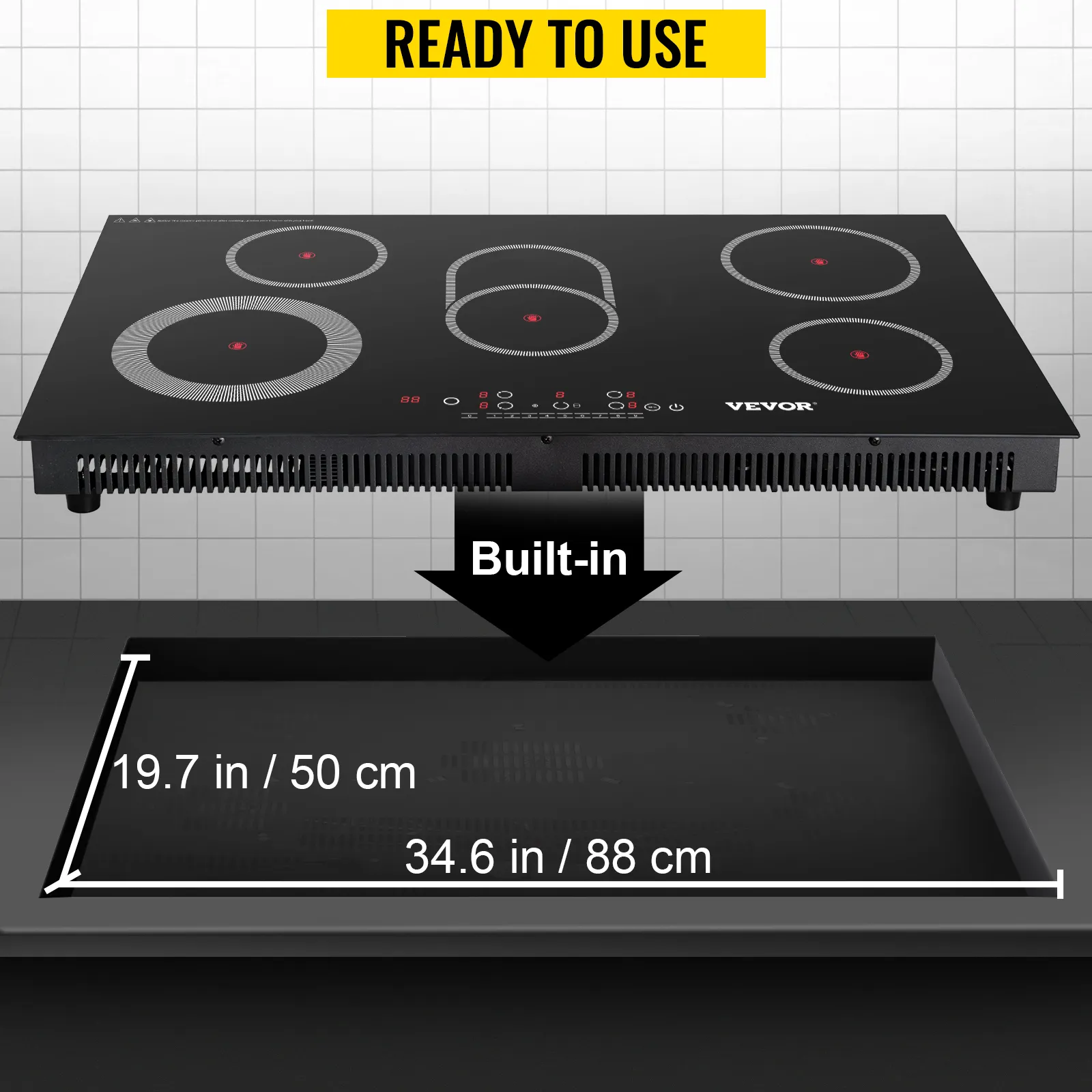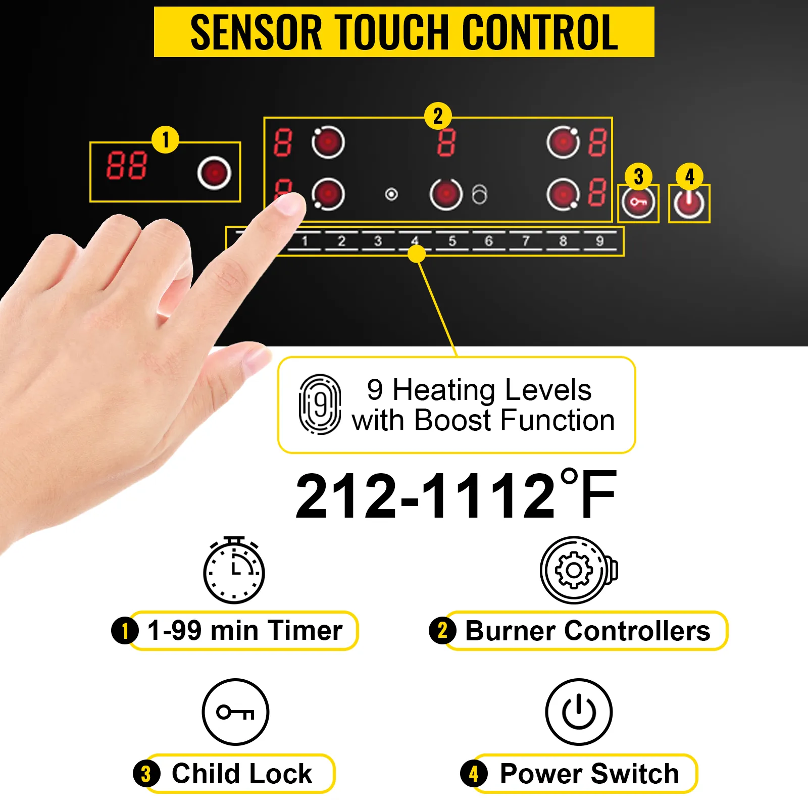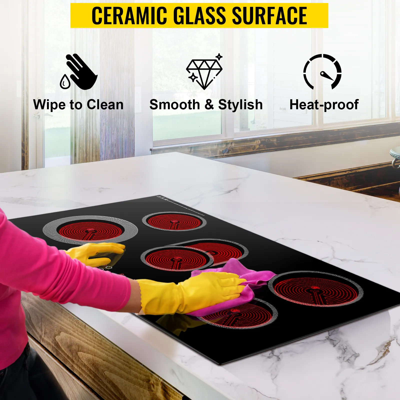 Our radiant cooktop adopts 5 burners with strong power, offering rapid and stable heating. It is equipped with sensor touch controls with 9 heating levels, a boost function, and a timer function. Meanwhile, there are several measures for security, including child lock, overheat protection, auto shut-off, and a residual heat indicator. This built-in ceramic cooktop is going to be your number one cooking companion. Turn up the heat, outshine the competition, and get ready to turn heads with VEVOR's electric cooktop.