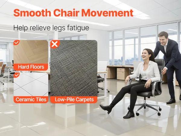 Large Coverage: The 36 x 48-inch (915 x 1225 mm) rectangular chair mat covers the chair’s movement range, making it suitable for small to medium work areas. It helps your chair glide smoothly and reduces leg pressure and fatigue