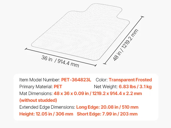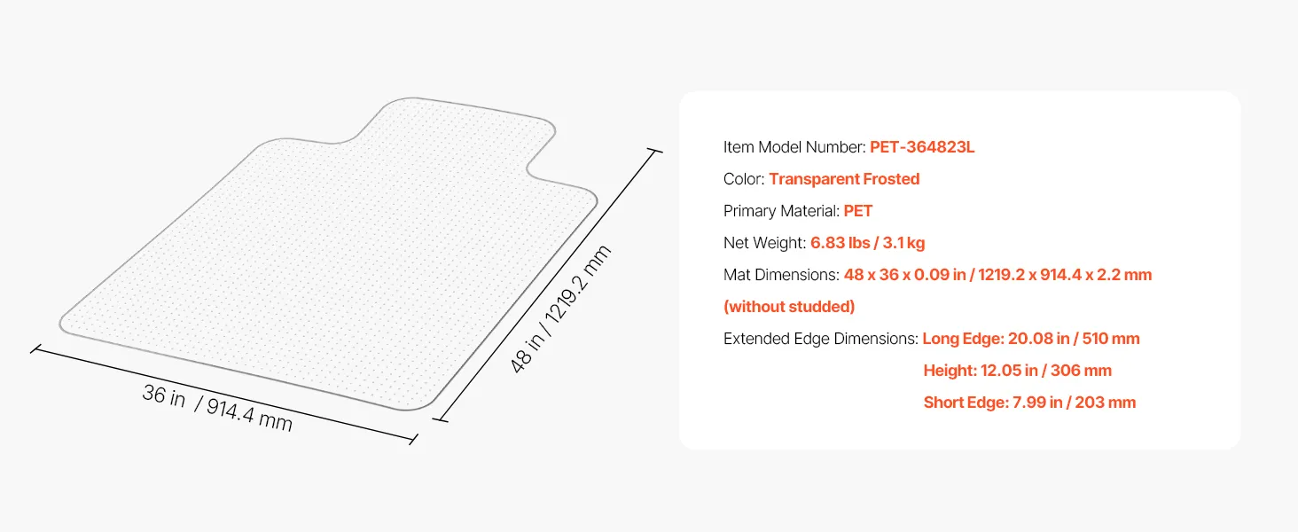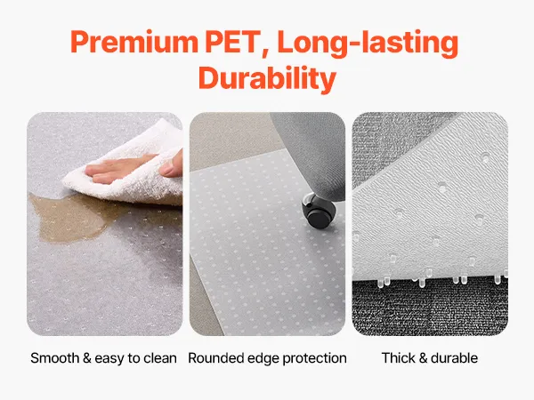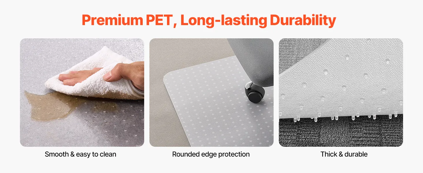 Durable & Easy to Clean: Crafted from 0.09-inch / 2.2mm thick PET, this under desk rug resists cracking and deformation. The smooth, waterproof surface wipes clean easily—say goodbye to stains and dirt in seconds