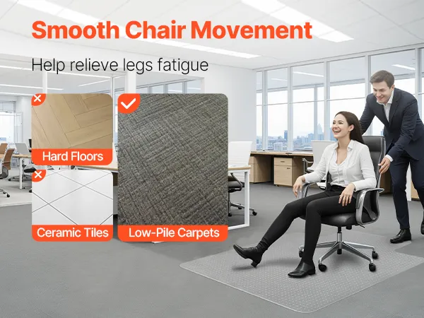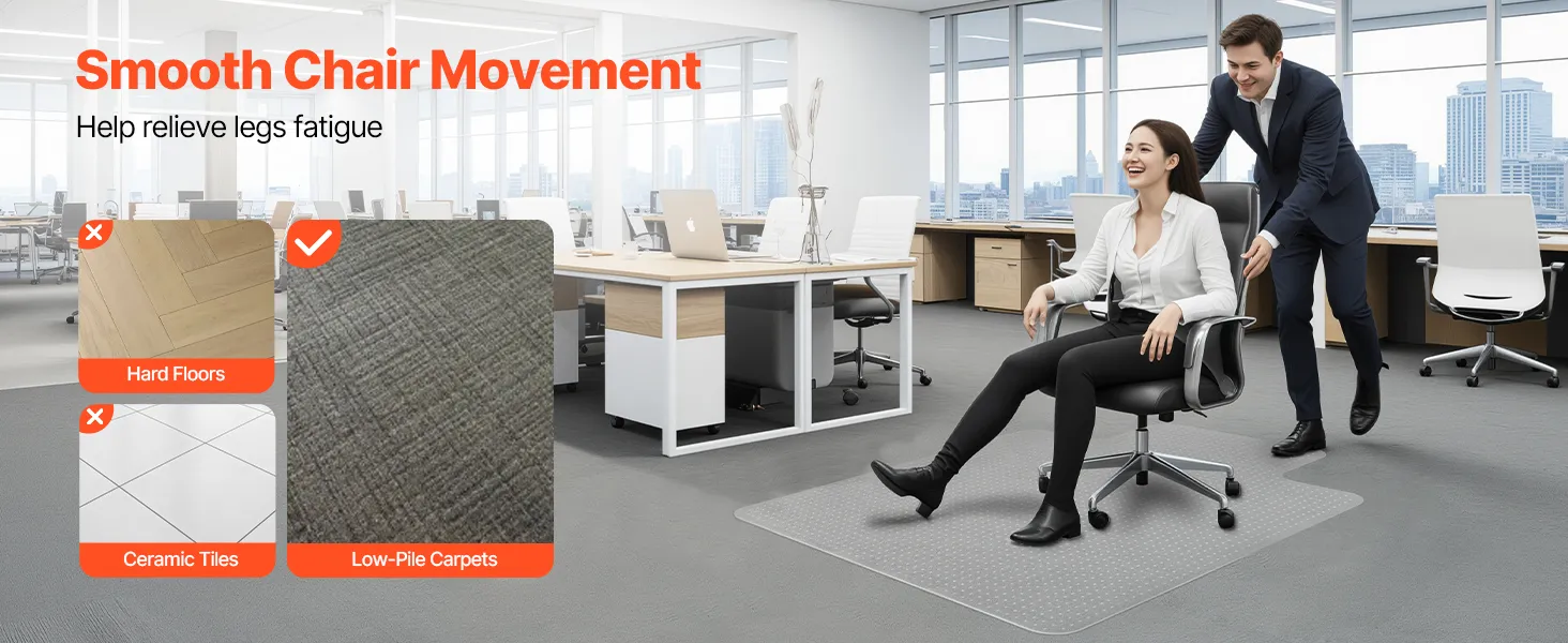 The smooth surface of our under desk rug lets your chair glide effortlessly while offering solid traction. This ergonomic design reduces leg pressure and fatigue, making long hours at the desk much more comfortable.