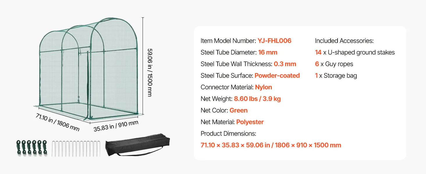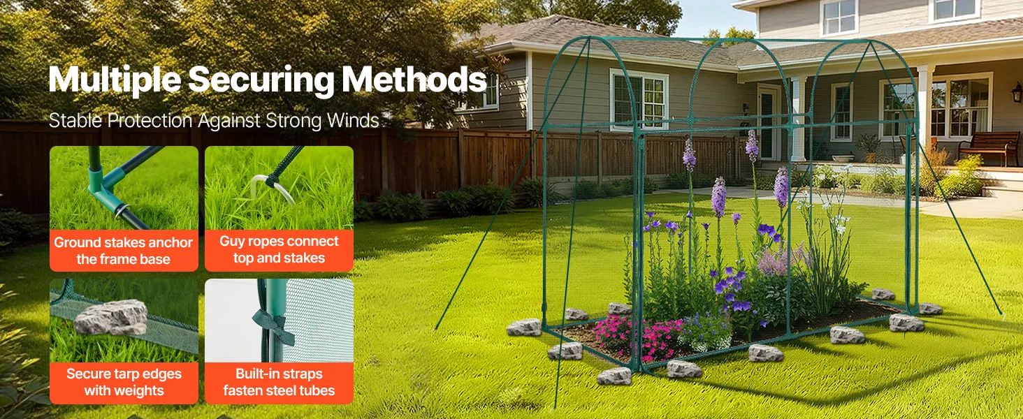 Stable & Wind-Resistant: Made of powder-coated steel tubes, our plant protection tent is rust- and corrosion-resistant. Reinforced plastic joints fit snugly with the main frame, while U-shaped ground stakes and guy ropes provide wind resistance