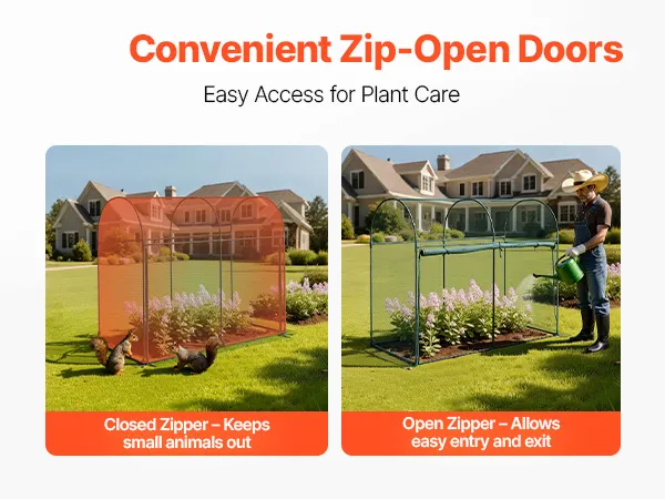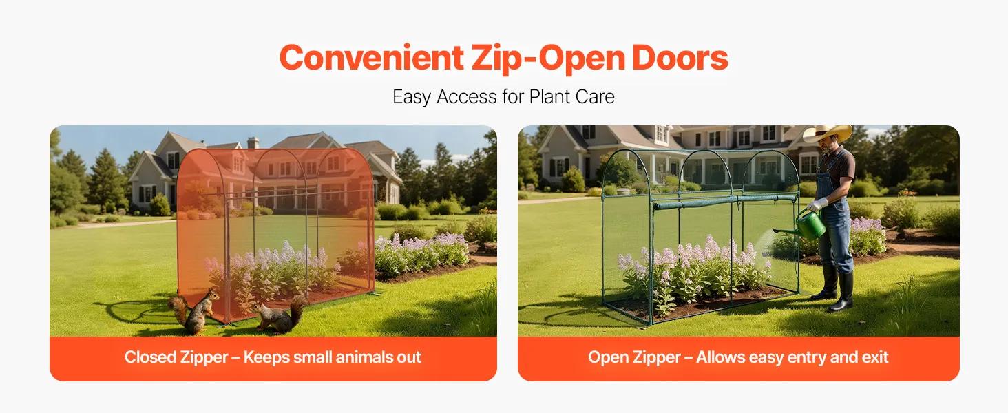 Equipped with convenient zip-open doors, this plant cage provides great ease for plant care. Zip closed to form a secure barrier against small animals, or unzip to easily access your plants for hassle-free plant care.