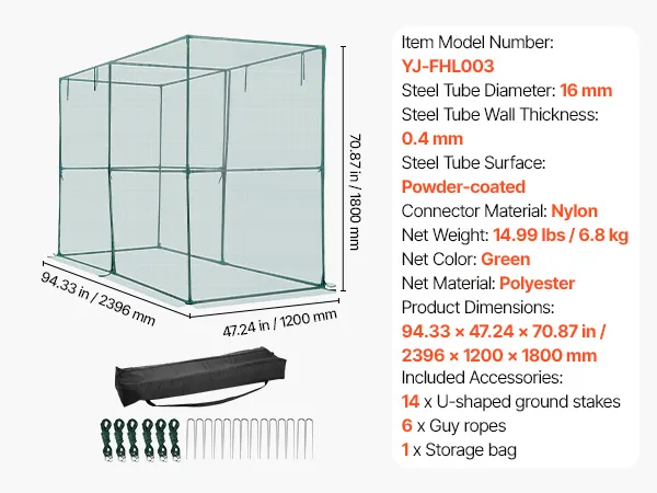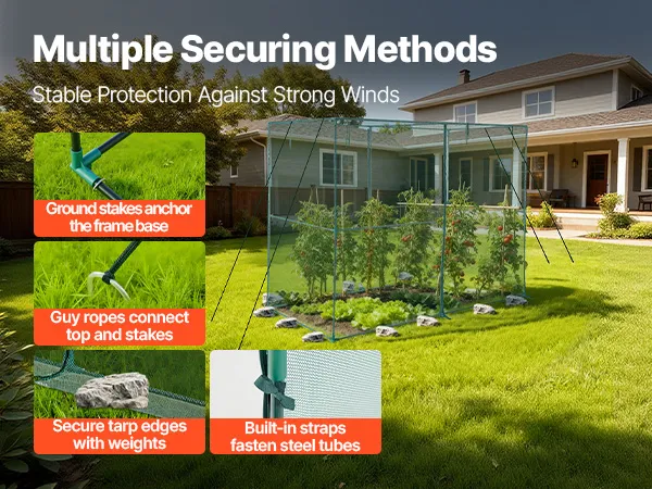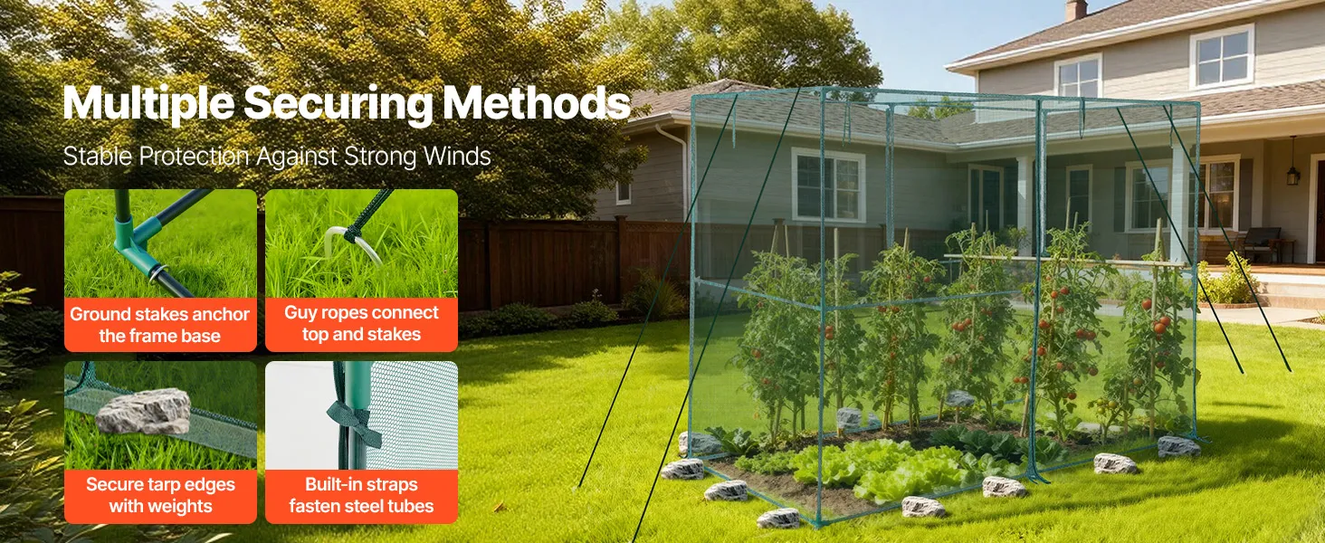 Stable & Wind-Resistant: Made of powder-coated steel tubes, our plant protection tent is rust- and corrosion-resistant. Reinforced plastic joints and side support rods add stability, while U-shaped ground stakes and guy ropes provide wind resistance