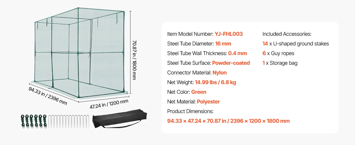 Spacious Interior: Measuring 94.33 x 47.24 x 70.87 in/2396 x 1200 x 1800 mm, this crop cages for garden provides ample space for vegetables, fruits, flowers, and other plants to thrive without external disturbance