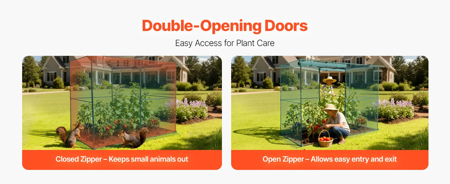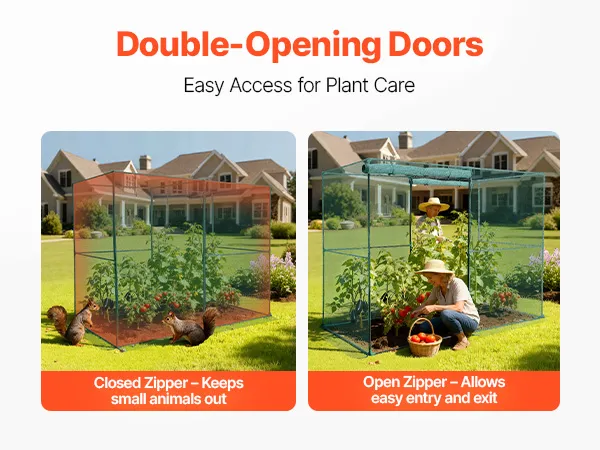 Equipped with convenient double-opening doors, this plant cage provides great ease for plant care. Zip closed to form a secure barrier against small animals, or unzip to easily access your plants for hassle-free plant care.