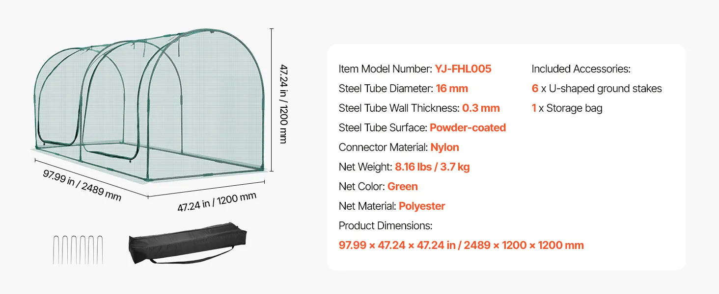 VEVOR Crop Cage, 2.48 x 1.2 x 1.2 m Plant Protection Tent with Zippered Door, Wind-Resistant Tall Crop Cage, Easy to Install, Outdoor Raised Bed Cover with Frame, Plant Netting for Garden Patio Lawn