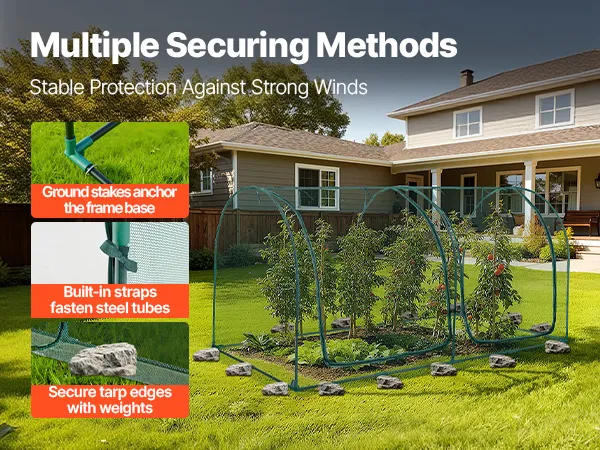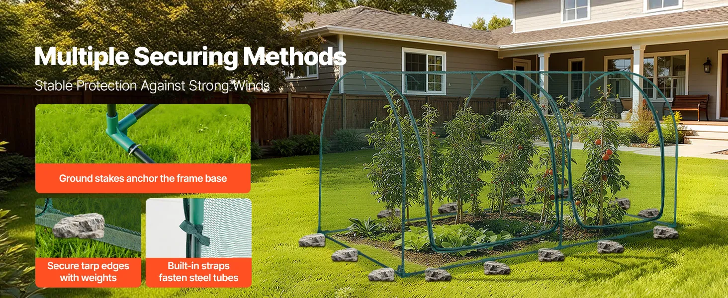 Stable & Wind-Resistant: Made of powder-coated steel tubes, our plant protection tent is rust- and corrosion-resistant. Reinforced plastic joints fit snugly with the main frame for added stability, while U-shaped ground stakes provide wind resistance