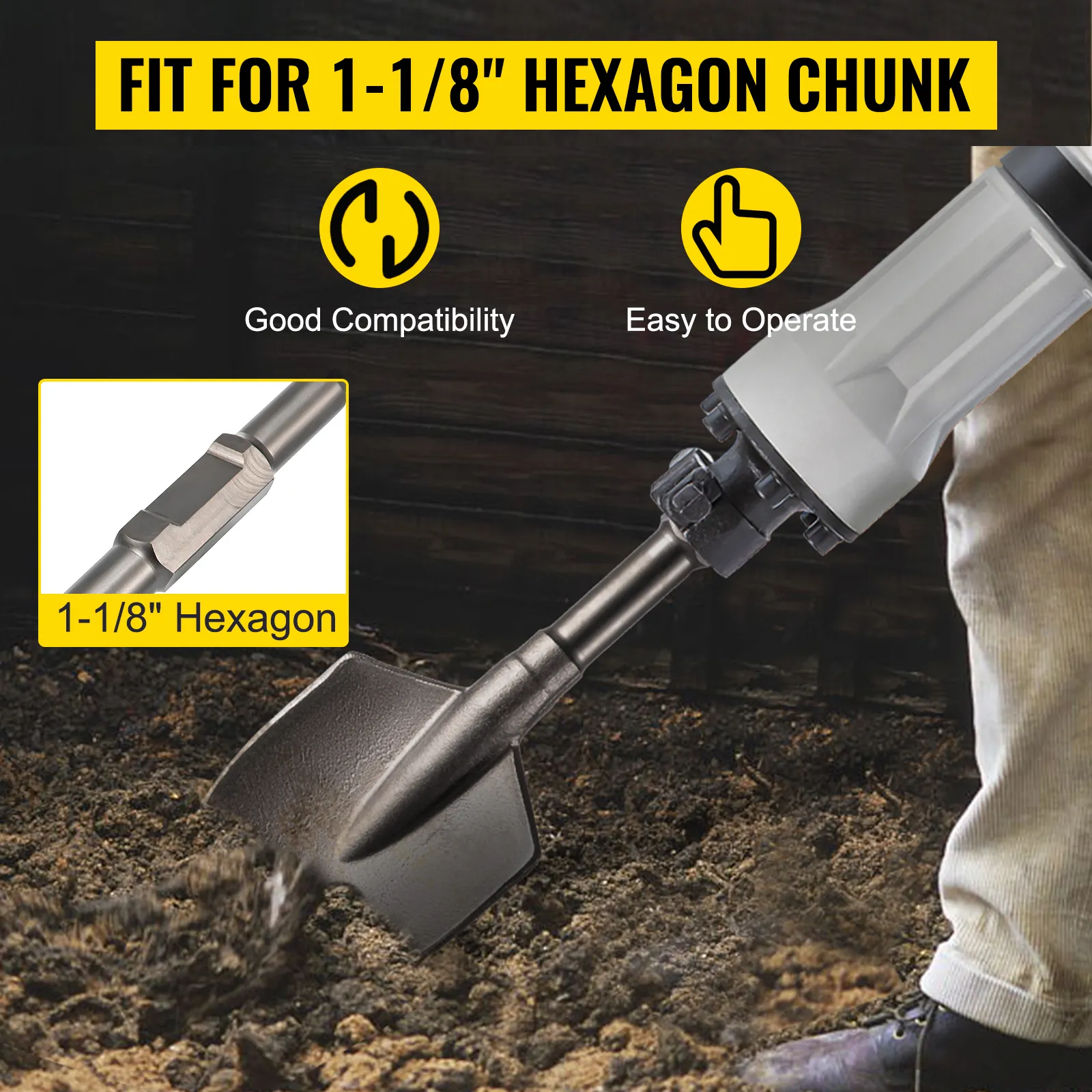 This clay chisel shovel features a 1-1/8" sized rotary hammer shank for compatibility with Bosch, DeWalt, Makita, Milwaukee, Hilti, or other 1-1/8" Hexagon hammer drills.