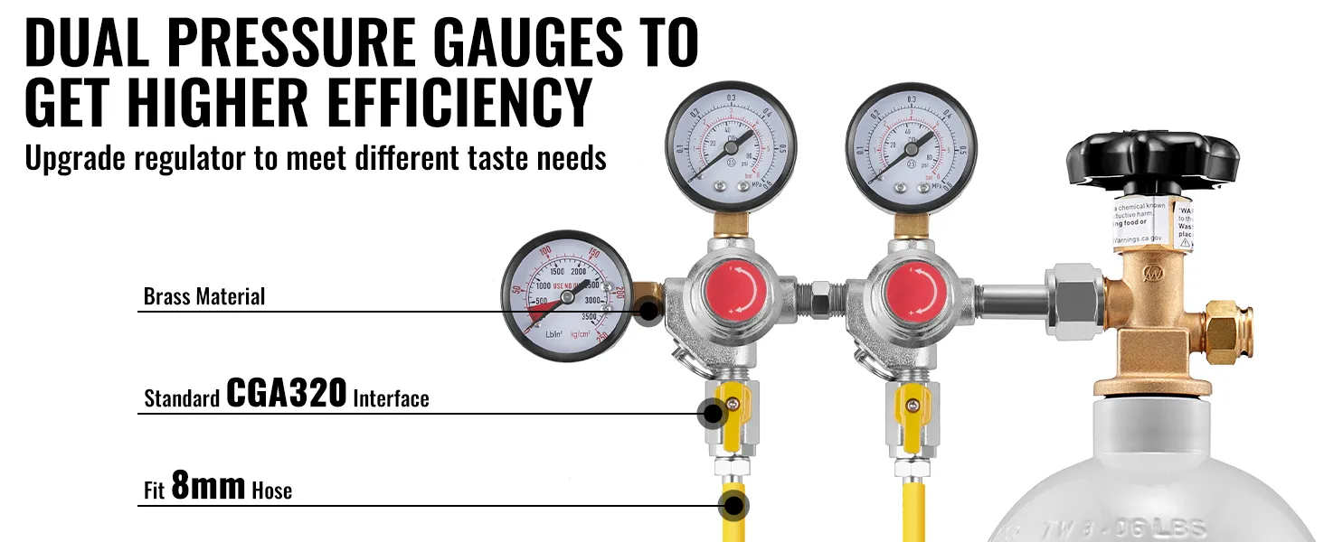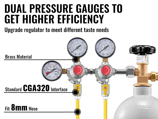Equipped with dual pressure gauges, this regulator offers simple monitoring and efficiency. Compatible with the CGA320 interface and an 8mm hose diameter, it integrates seamlessly with various beer kegs. Its quick and hassle-free installation process is ideal for homebrewers using different keg systems. Designed for convenience, this regulator ensures a smooth setup for any brewing environment.