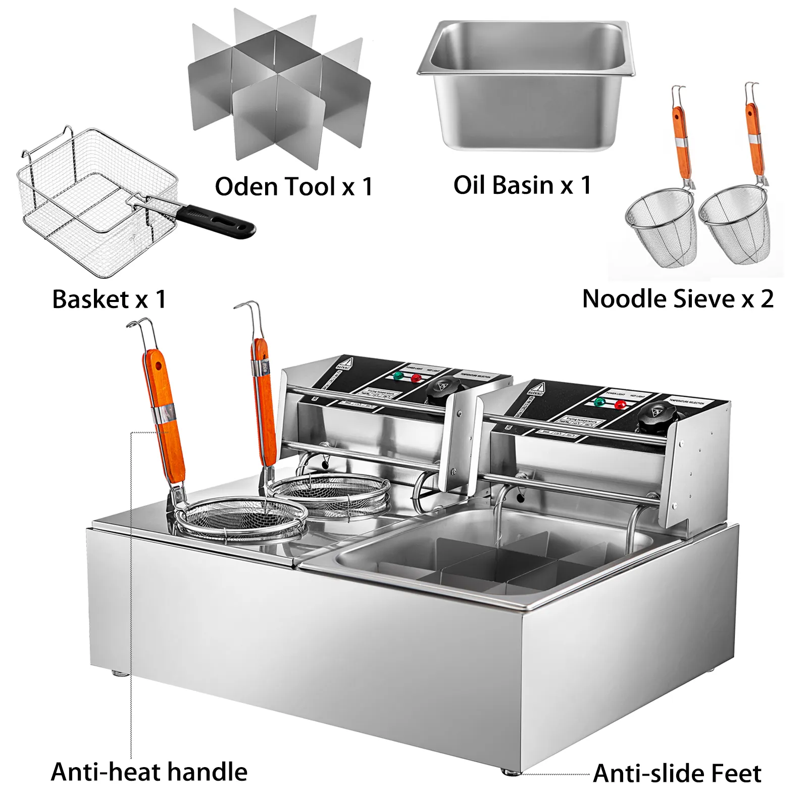 • 【MULTIFUNCTIONAL USE】- Unlike other similar machines in the market, our dual tank electric countertop deep fryer not only can fry chips, fish, chicken, doughnuts, fritters, onion rings, shrimp, but also boil noodles and vegetables. Making Oden is also a piece of cake with our double electric fryer.