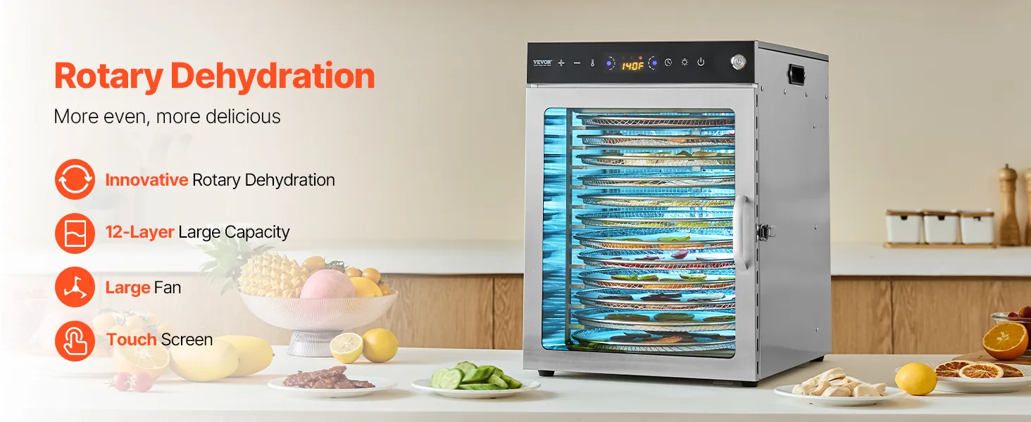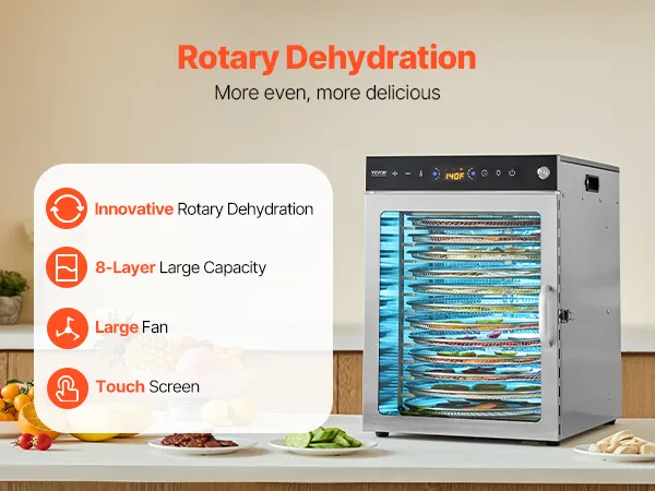 Rotary Dehydration: The innovative rotary dehydration, a fan and a circulating airflow design ensure even heat and airflow distribution. This food dehydrator machine even dries various ingredients while preserving nutrients without loss