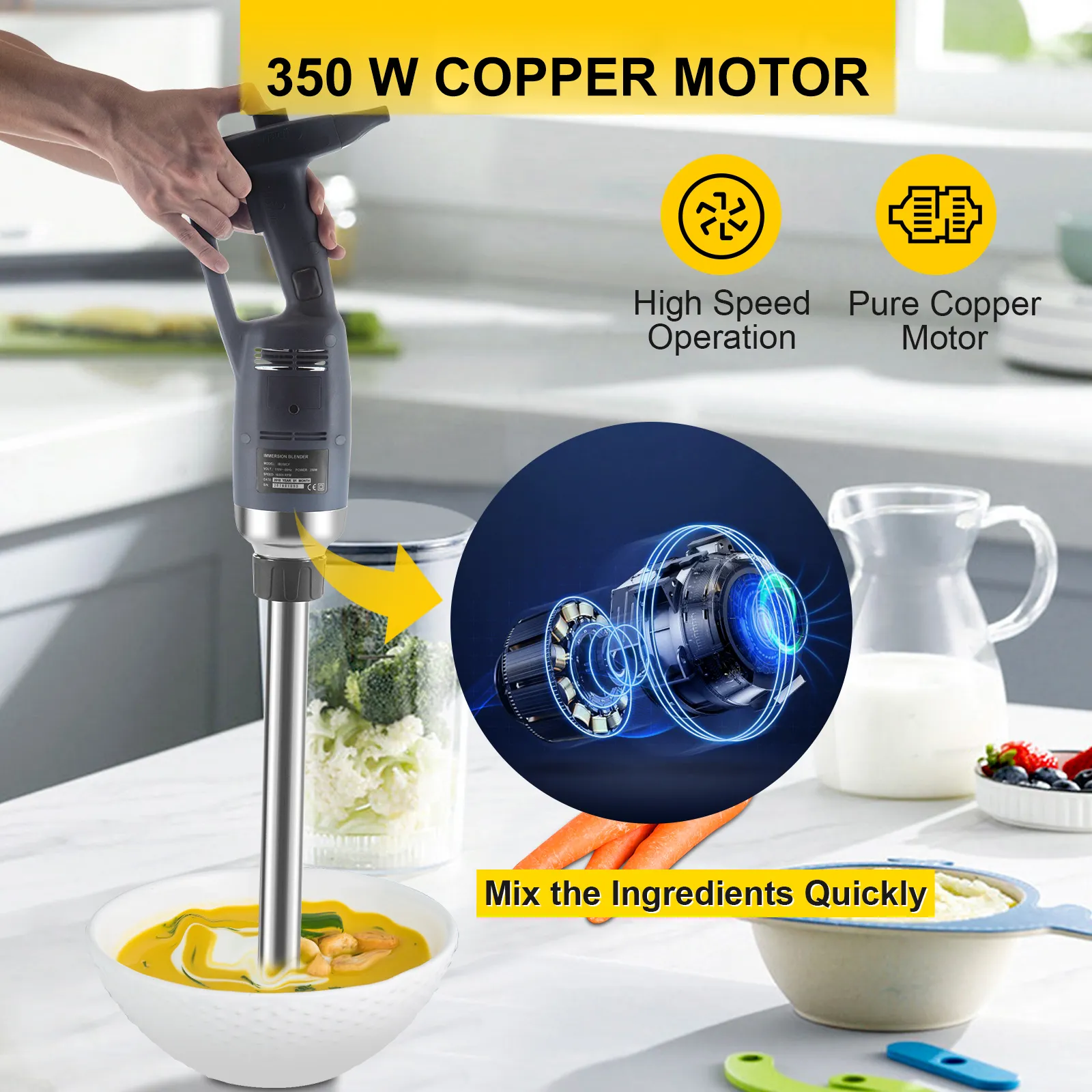 【PURE COPPER MOTOR】- The commercial immersion blender is equipped with a strong, pure copper motor with a power of 750W, which provides higher power than the general motor. It can help you quickly mix the raw materials together and achieve the purpose of stirring.