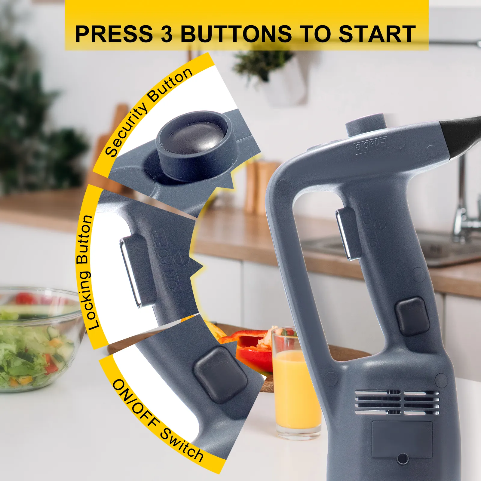 【SECURITY START BUTTON】 - Our heavy duty immersion blender has the function of secure start, when you plug in the power, you need to press three buttons at the same time to start, so as to effectively avoid accidents.