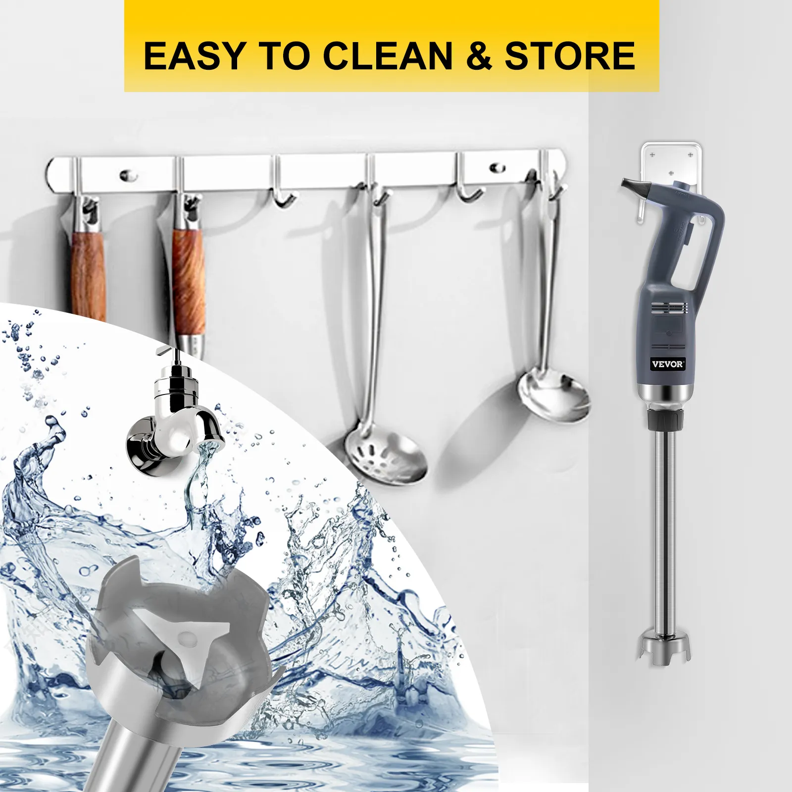 This commercial immersion blender is suitable for commercial and home uses. It can quickly mix ingredients through a powerful motor and stainless steel blade. You can start it surely with three buttons. Its handle is easier to grasp, firmer, and more labor-saving. You can use our wall mount to hang it after cleaning.