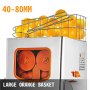 VEVOR commercial juicer with large orange basket holding 40-80mm oranges.