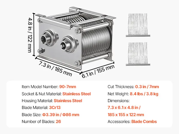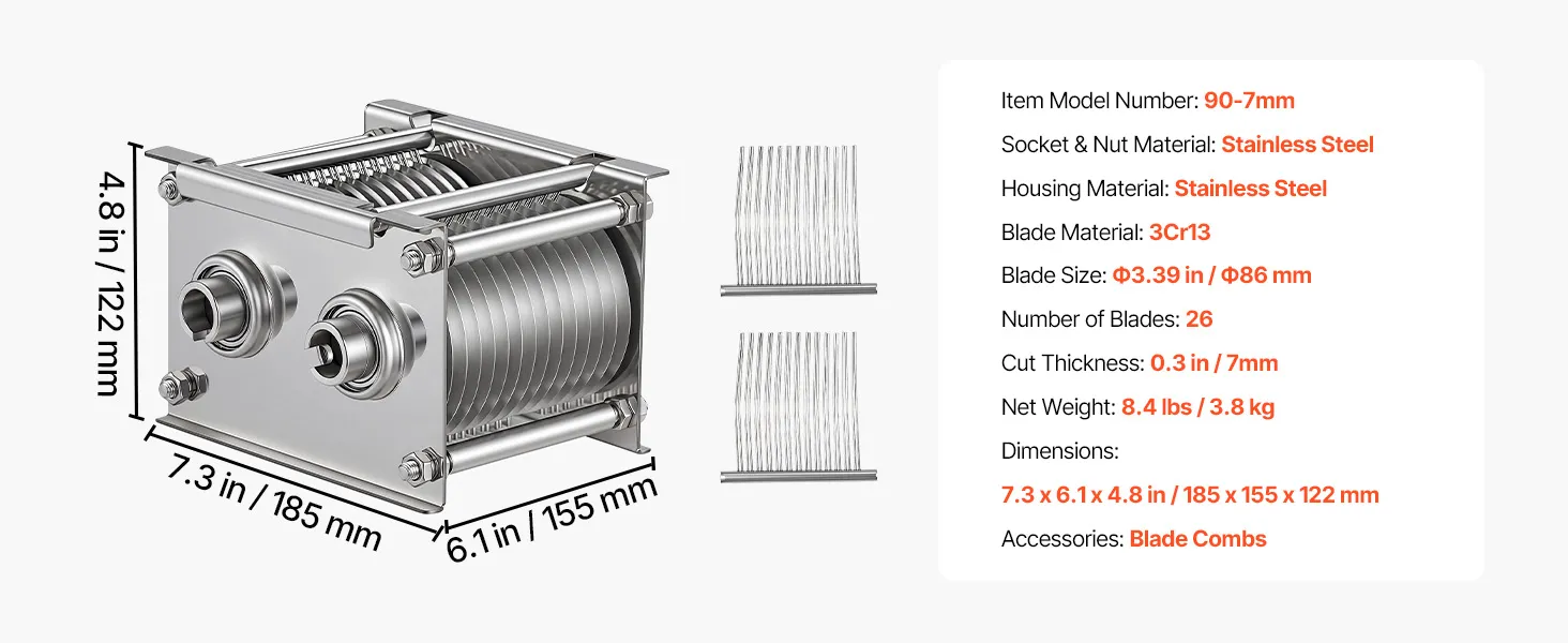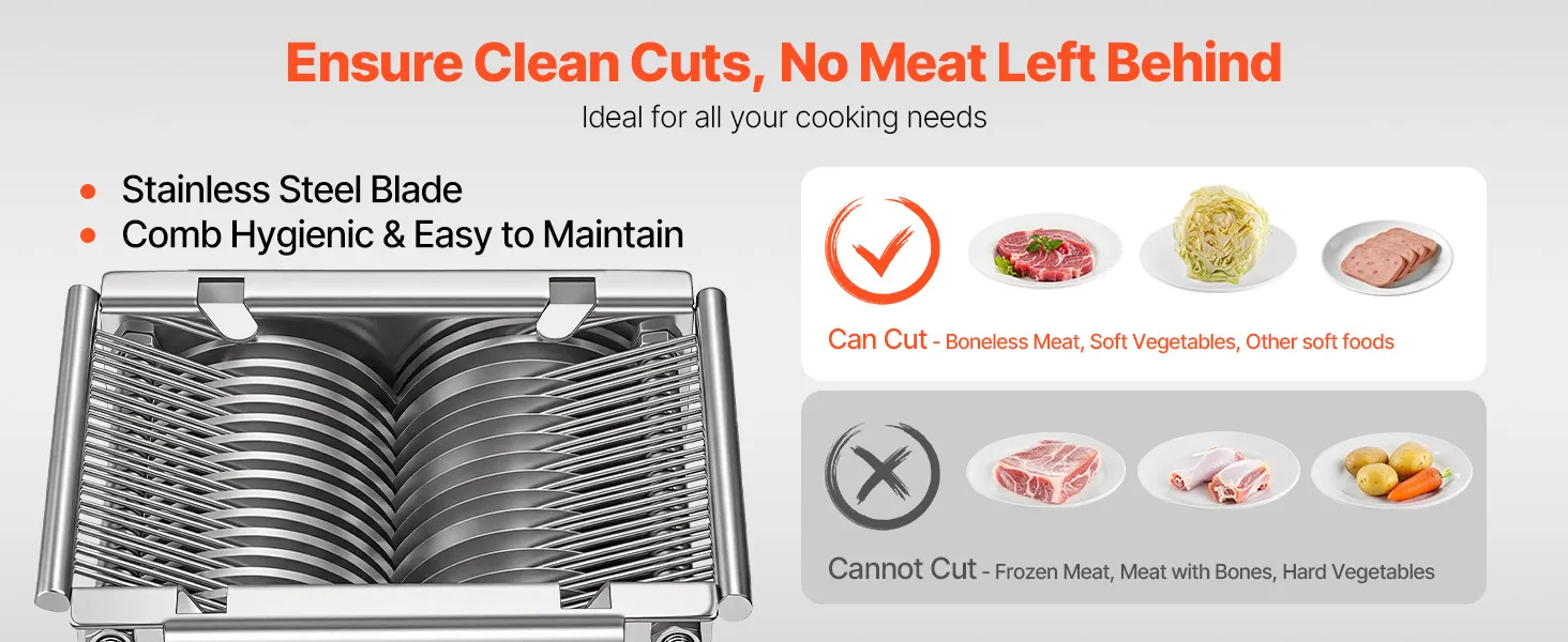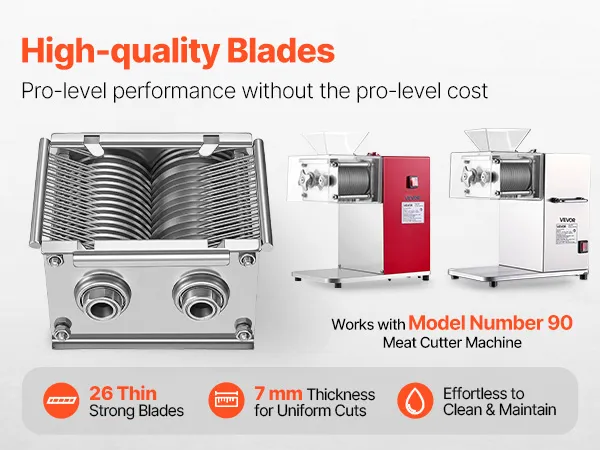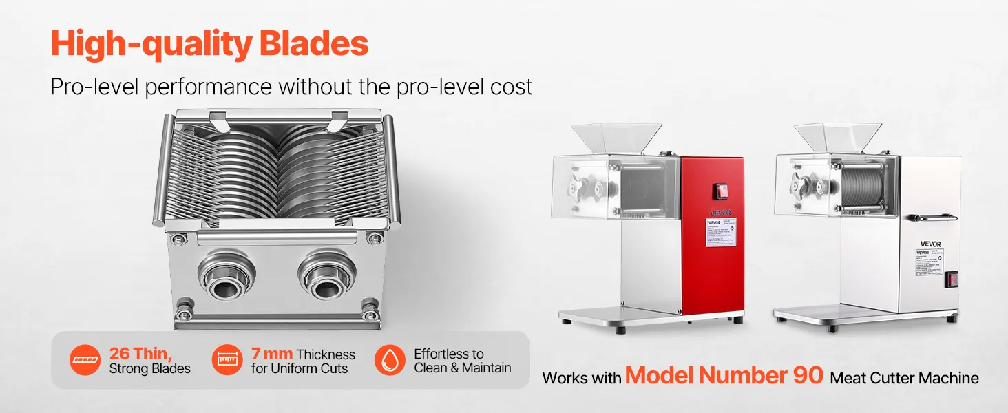 Premium Stainless Steel Blades: Equipped with 26 sharp, thin stainless steel blades to ensure smooth, clean cutting with no meat left behind. Added spacers help keep the machine running stably and efficiently