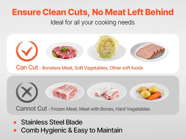 The meat cutter machine blade is suitable for boneless fresh meat, soft vegetables, toast bread, and more. Not suitable for frozen meat, bone-in meat, or hard vegetables.