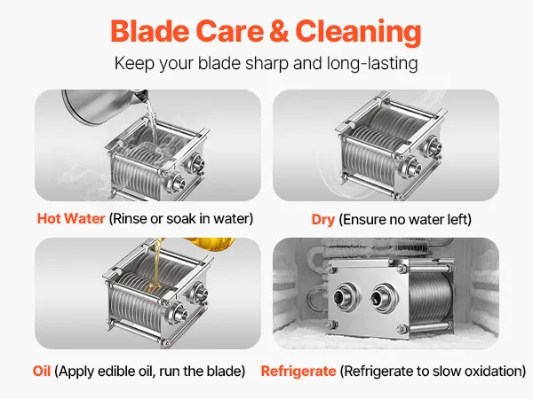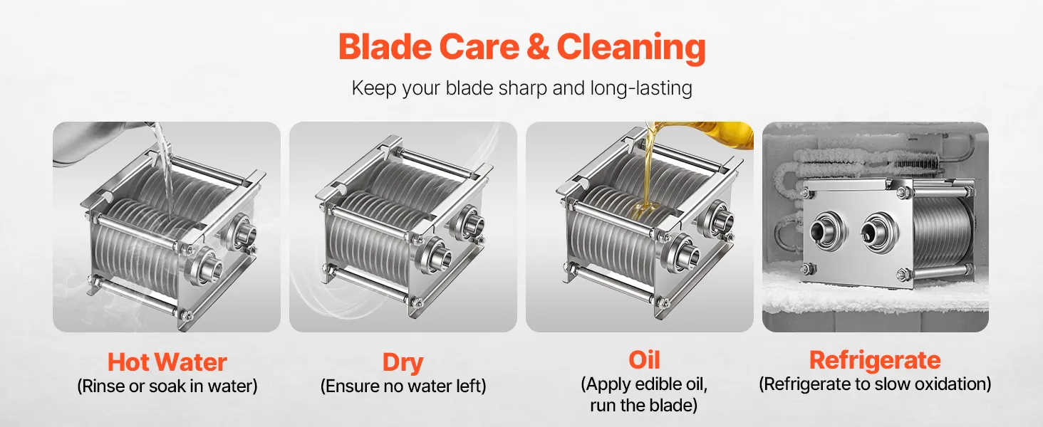 Easy Blade Maintenance: After cleaning, dry the meat cutter blade thoroughly and apply a light coat of food-grade oil. Run the machine briefly to ensure the oil is evenly distributed over the blade