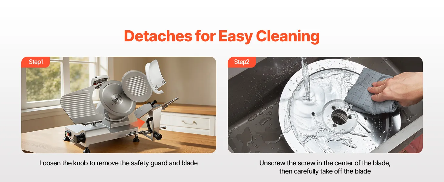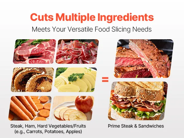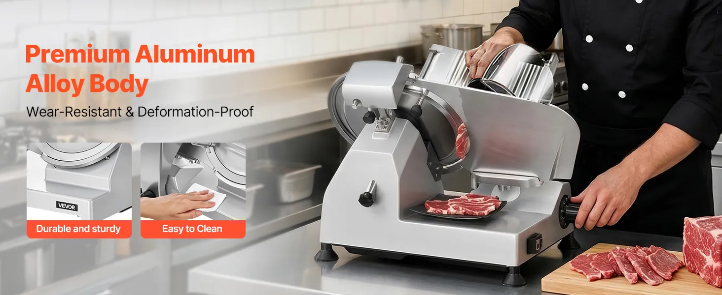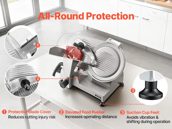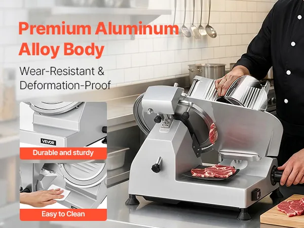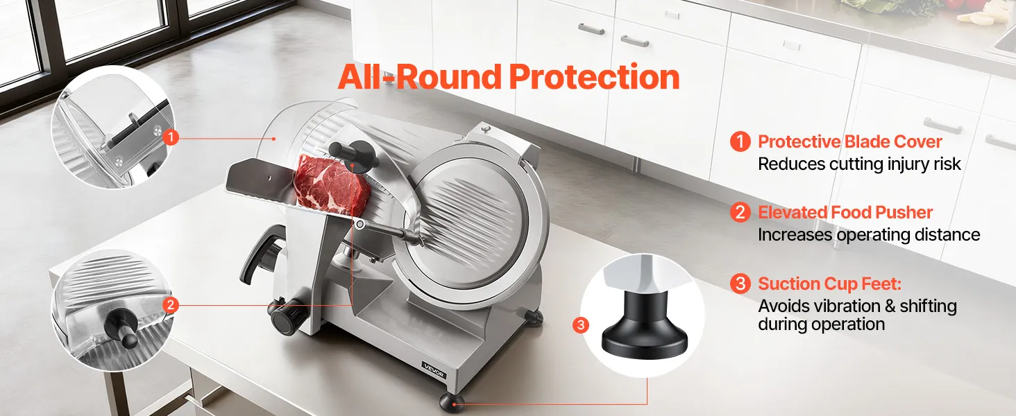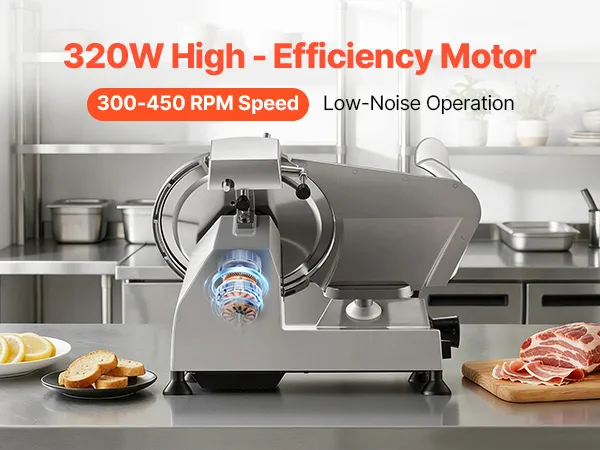 Efficient Slicing: Powered by a powerful 320W motor and operating at 300–450 RPM, this commercial meat slicer delivers smooth, high-speed cutting. Produce evenly sliced meat in less time, eliminating unsafe manual cuts and boosting your meal prep efficiency