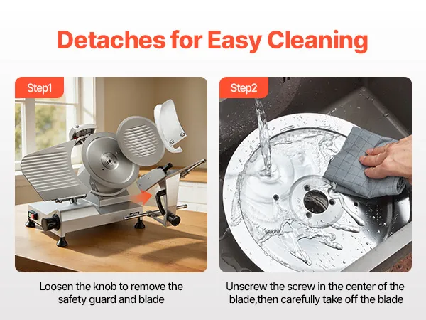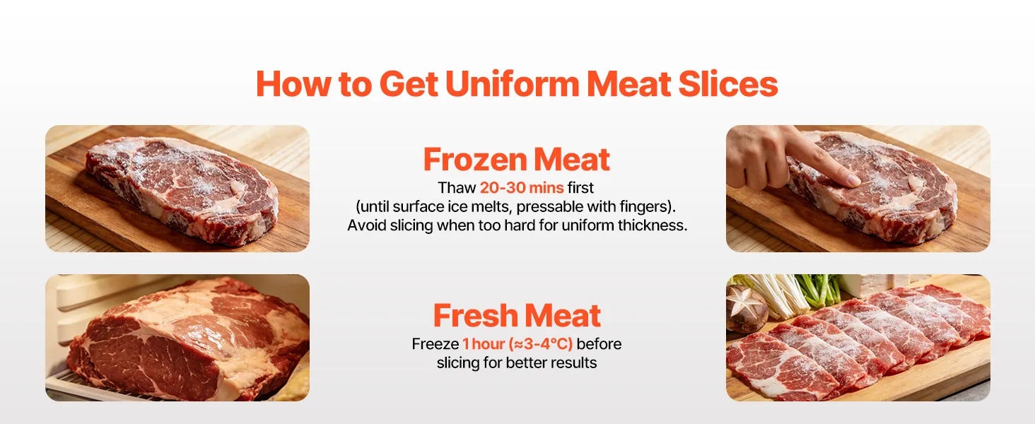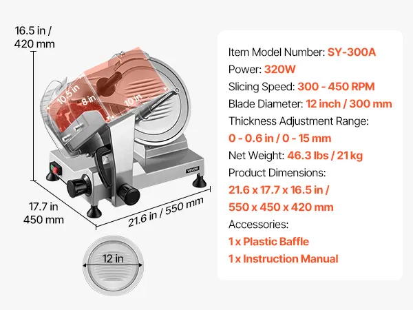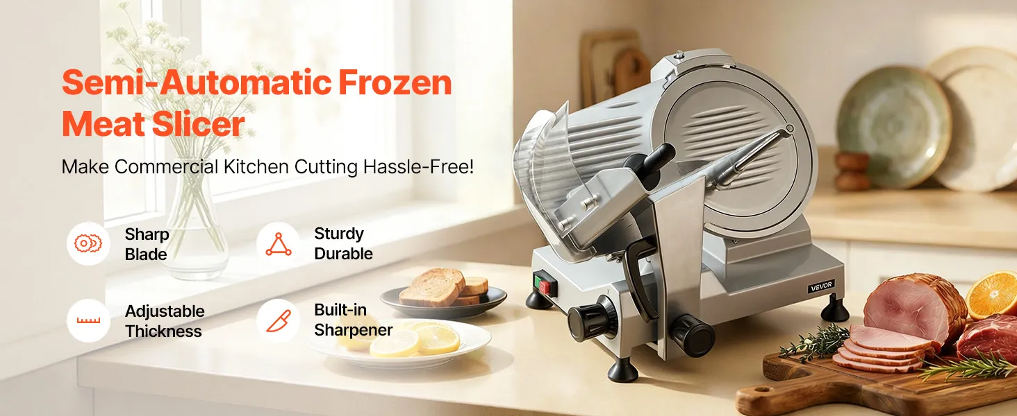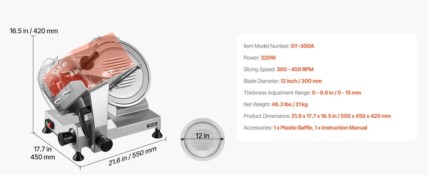 Efficient Slicing: Powered by a powerful 320W motor and operating at 300–450 RPM, this commercial meat slicer delivers smooth, high-speed cutting. Produce evenly sliced meat in less time, eliminating unsafe manual cuts and boosting your meal prep efficiency