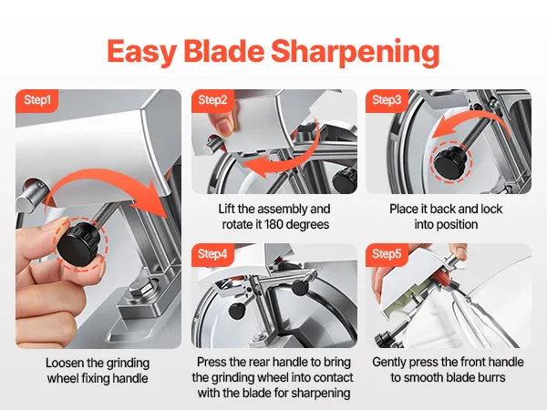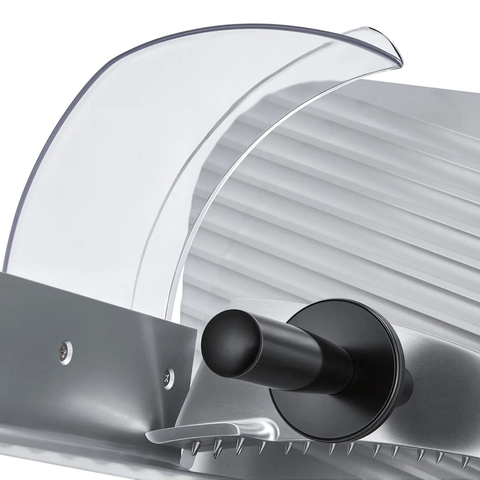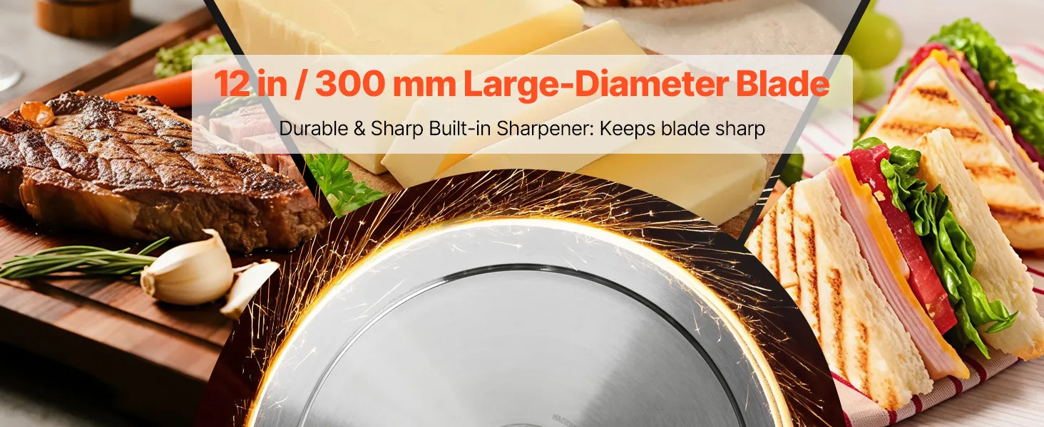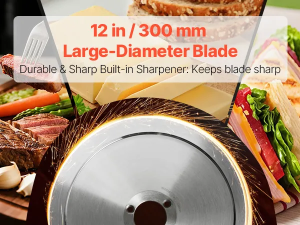 Durable & Sharp Blade: Featuring a 12-inch (300mm) carbon steel blade, this meat deli slicer glides through frozen meat, steak, ham, carrots, potatoes, hard vegetables, and more. A built-in sharpening stone is also included for convenient blade maintenance whenever needed
