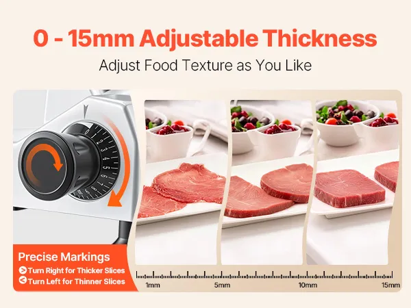 Adjustable Thickness: Equipped with a simple thickness adjustment knob, this electric food slicer lets you choose settings from 0 to 0.6 inches (0–15mm). Easily customize thin slices or thicker cuts to match your different food preparation needs