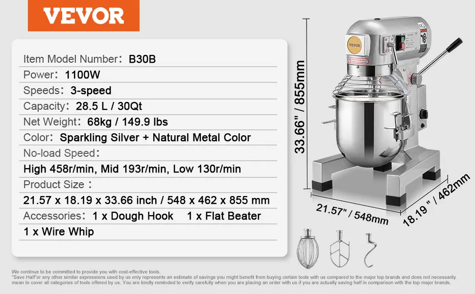 VEVOR Commercial Mixer with a 28.5 L mixing bowl, ideal for mixing large quantities of food at once. It features a powerful motor with 3 adjustable speeds (High 458r/min, Medium 193r/min, Low 130r/min) and comes with 3 mixing attachments to handle various ingredients effortlessly.