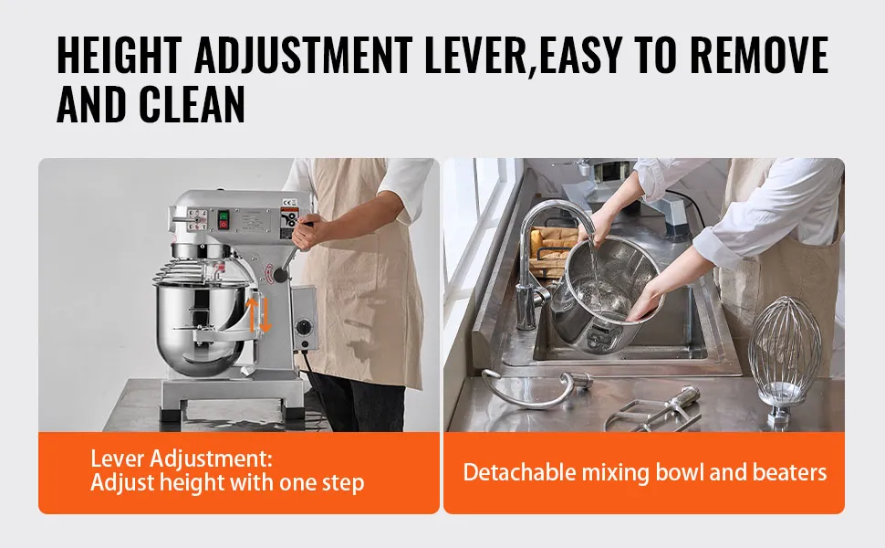 Innovative Design: It features a lever adjuster for easy raising or lowering of the bowl, which is more convenient and quicker compared to traditional wheel adjustments. Additionally, all components that come in contact with food, including the bowl, hooks, and rods, are made of food-grade stainless steel. These reliable components are rust-resistant, corrosion-resistant, and easy to clean.