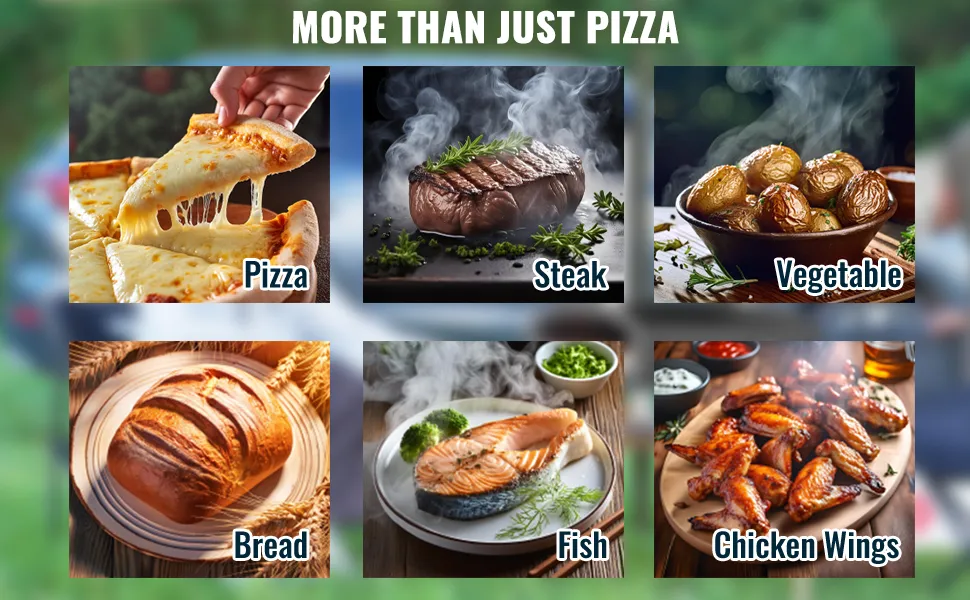 Efficient Baking: Bake in just 90 seconds with a 15-minute preheat, reaching temperatures up to 1000°F / 540℃. Ideal for baking 12-inch pizzas and cooking various meats, fish, and vegetables.