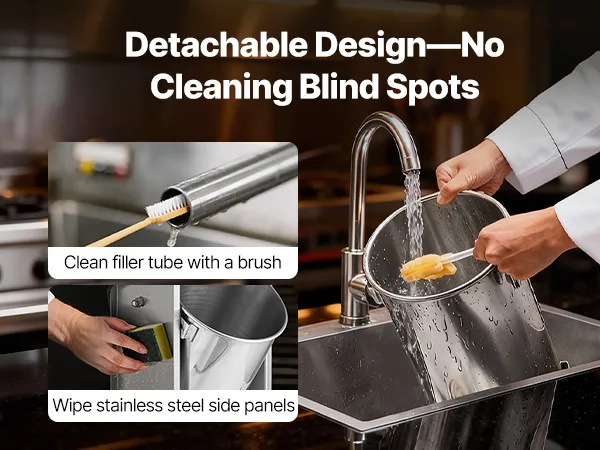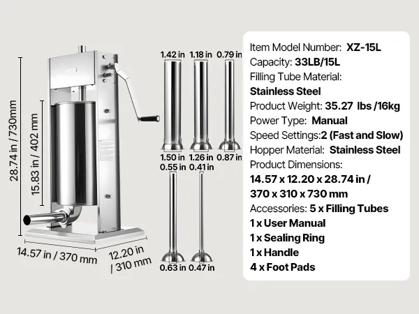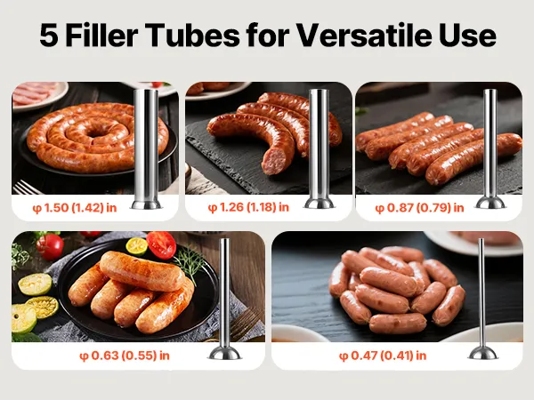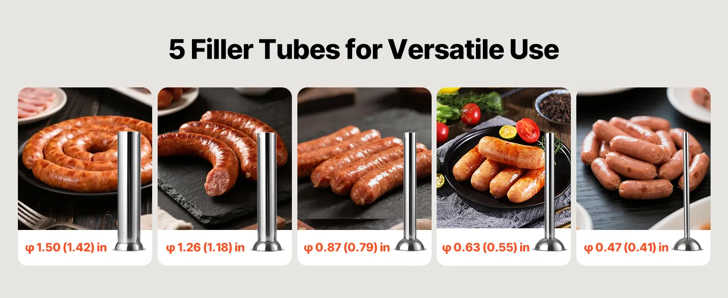 Multiple Tube Sizes: This vertical sausage stuffer comes with five premium stuffing tubes: ⌀0.47(0.41) in, ⌀0.63(0.55) in, ⌀0.87(0.79) in, ⌀1.26(1.18) in, and ⌀1.50(1.42) in. All components that contact food are smooth, burr-free, and comply with food-grade standards