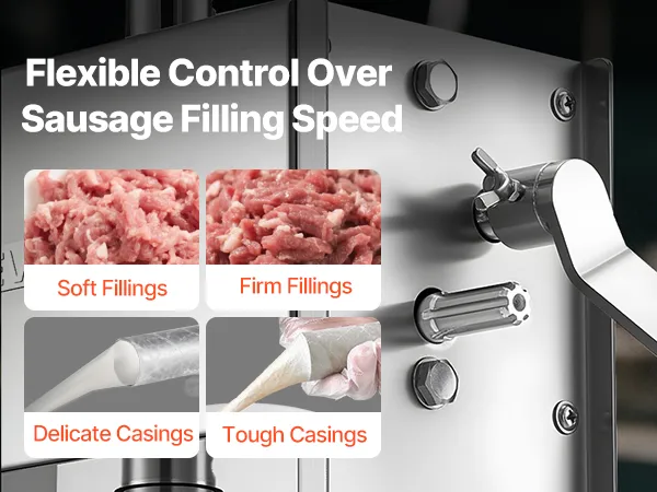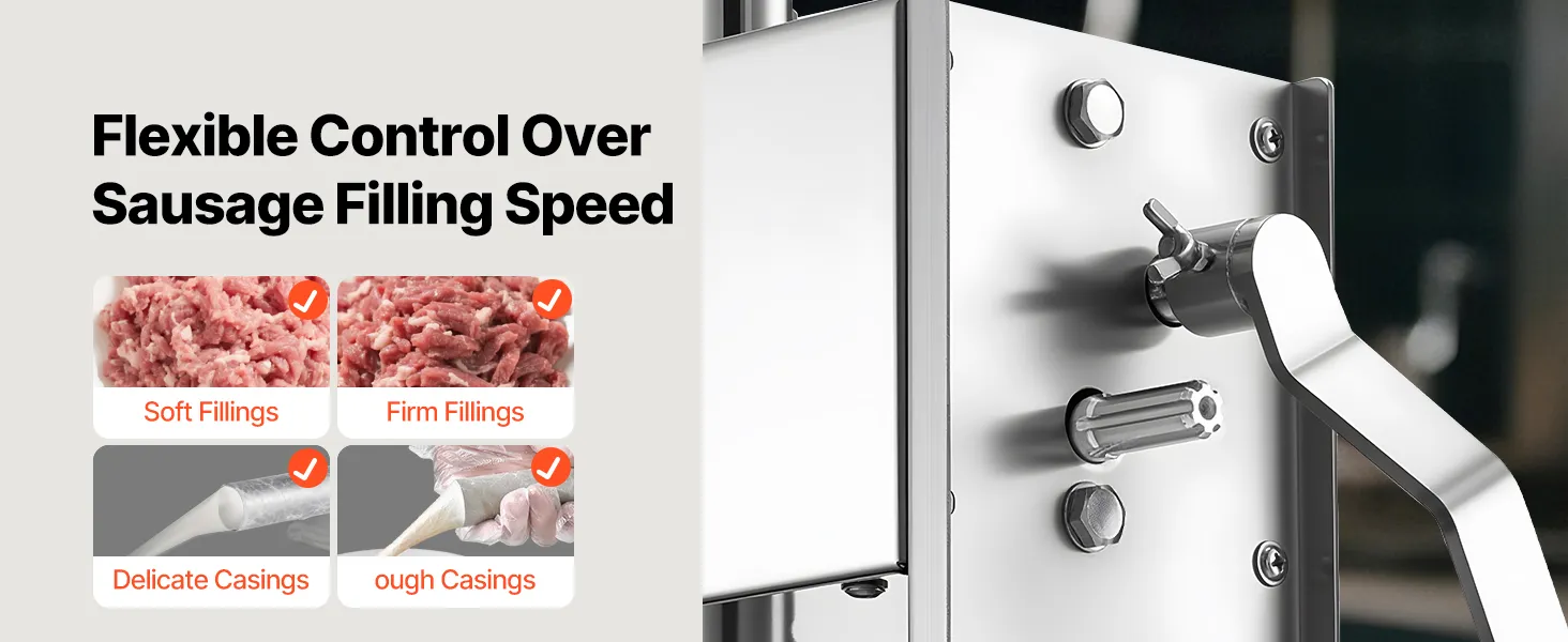 Two Speed Options: This manual sausage stuffer is designed with fast and slow gears. The high speed allows quick lifting and lowering, while the low speed is ideal for stuffing. The ergonomic handle is comfortable to grip, helping make the entire process smoother and more productive