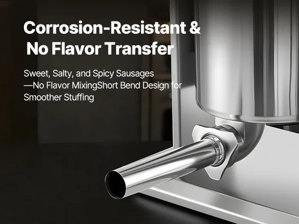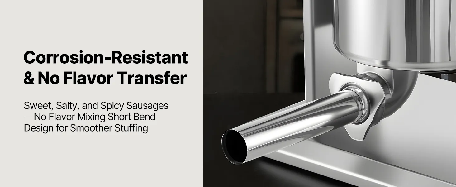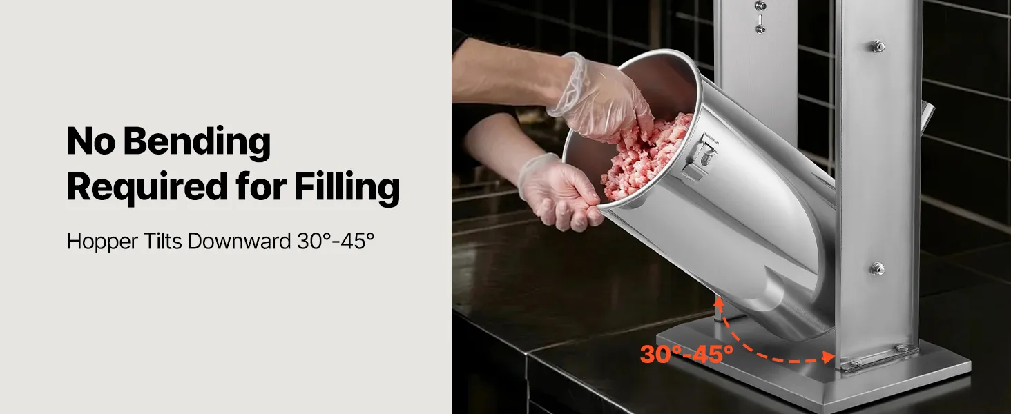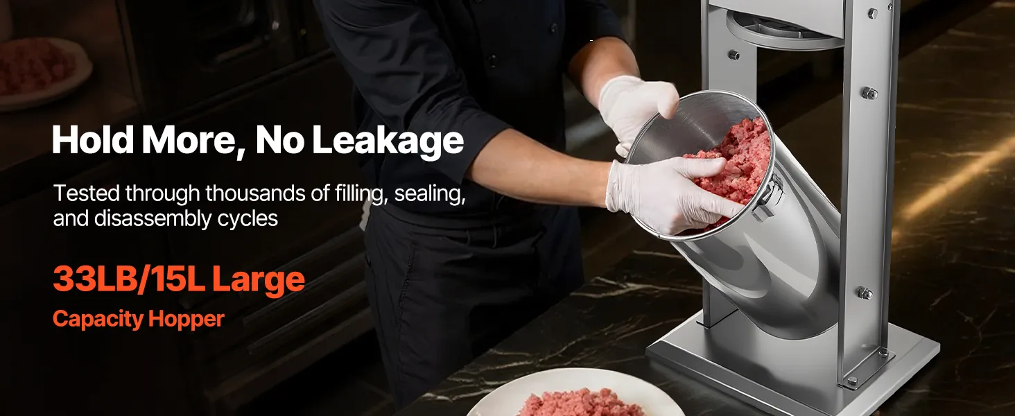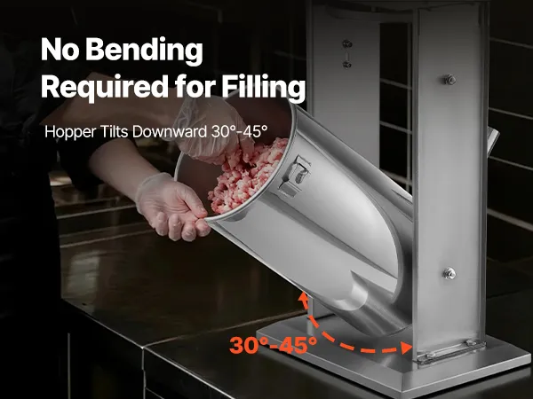 Generous Capacity: The tilting barrel of this meat stuffer can hold up to 33 lbs / 15 L of meat. Ideal for producing larger batches at once, it reduces the need for constant refilling. The barrel, tubes, frame, and base are all crafted from stainless steel for long-lasting, rust-resistant use
