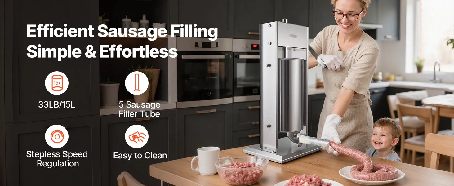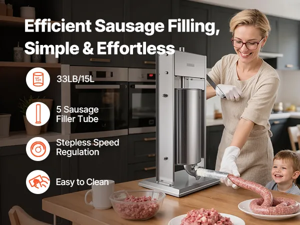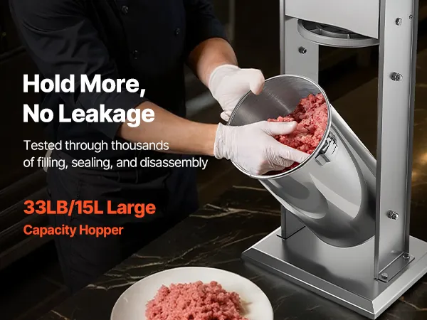 This manual sausage stuffer features an upgraded pressure plate with vent holes, producing firmer sausages with fewer air bubbles. With 2-speed control and an 33 lbs / 15 L large capacity, it's ideal for efficient home sausage making.