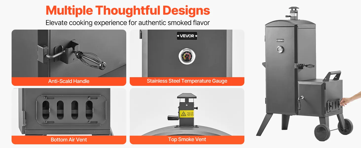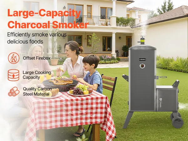 Offset Firebox: VEVOR charcoal smoker features an offset firebox design that separates the cooking chamber from the charcoal chamber, minimizing temperature fluctuation and smoke loss when adding the charcoal. Infuse your food with richer, smoky flavor and aroma